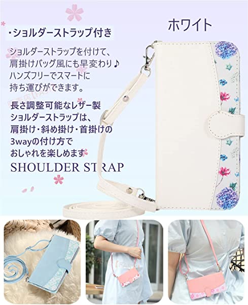 ● おすすめのポイントはショルダータイプのストラップ付き。 長さが調節可能のショルダーストラップ付きでショルダーバッグ風にも首掛けにも出来る大人らしい手帳型スマホケースです。愛らしくキュートな花柄×無地。若い女性に圧倒的人気!