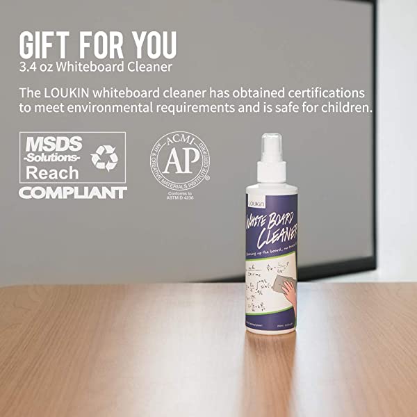 おまけ: 100mlのホワイトボードクリーナー (AP 認定、非毒性&低臭気) が 1 本付いています。LOUKIN のクリーナーを使えば、消えにくいマーカーのインクが綺麗に消えます。