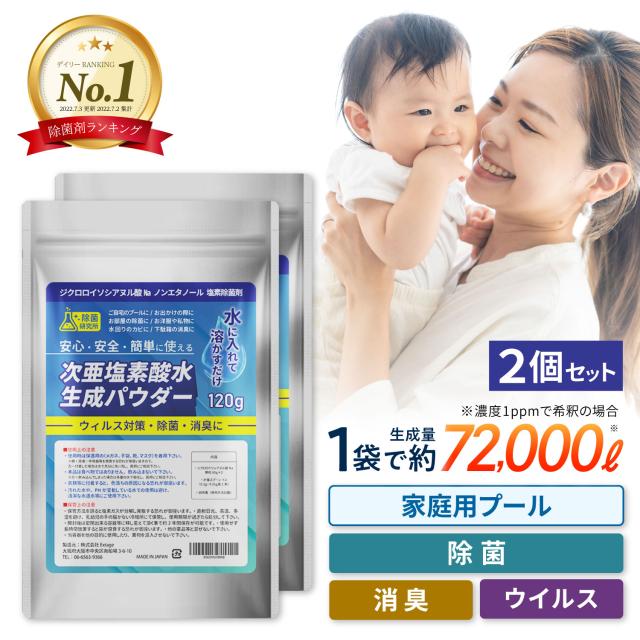 次亜塩素酸水 パウダー 粉末 抗菌 消毒 消臭 洗浄 プール塩素 ウイルス対策 120g 2個セット 加湿器 ペット 日本製 計量スプーン2本付き プール除菌剤 塩素除菌剤 家庭用プール ジクロロイソシアヌル酸 除菌研究所 送料無料
