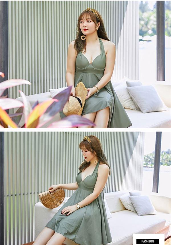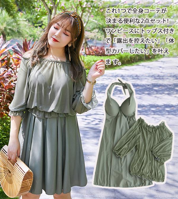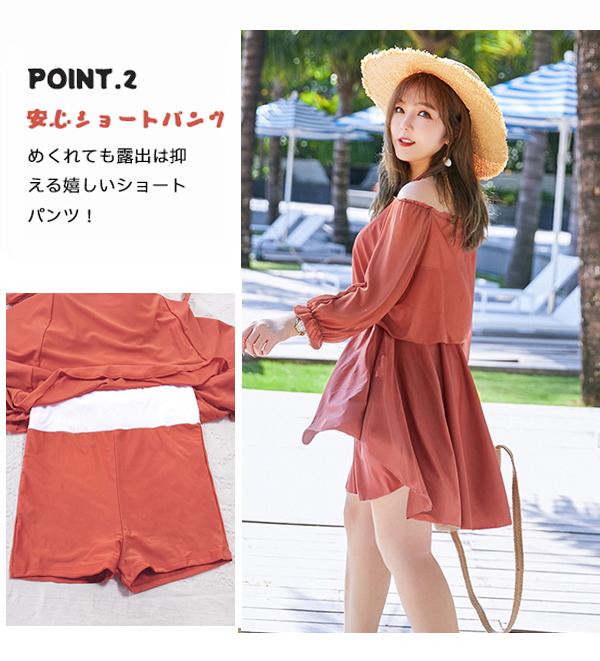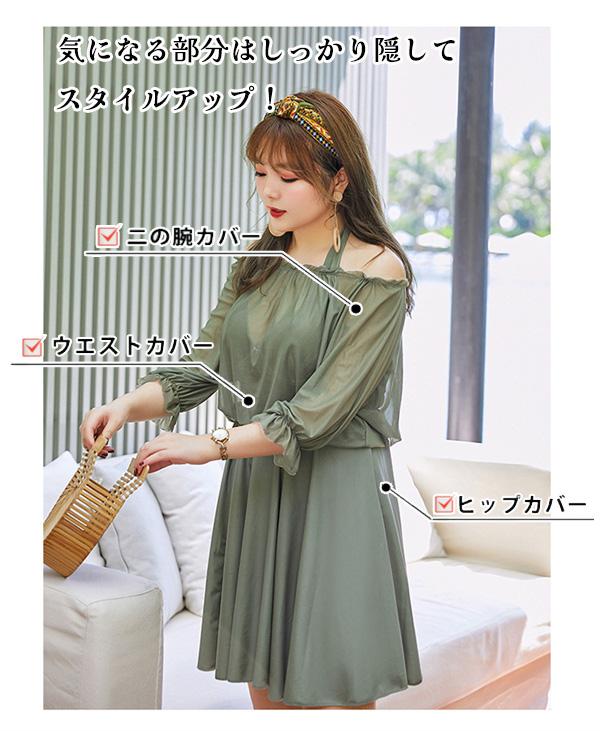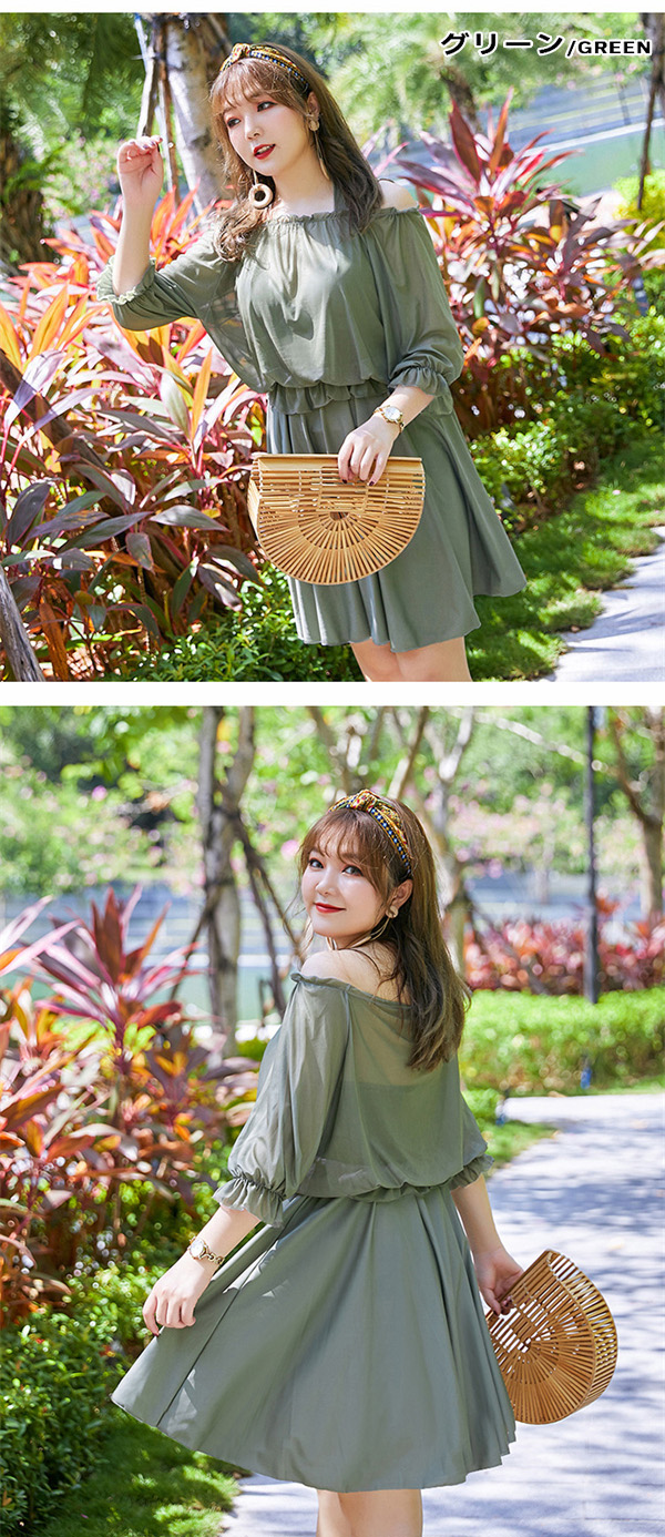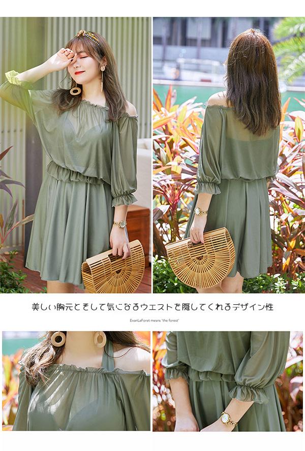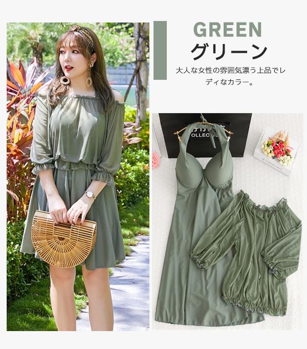 体型カバー 水着 大きいサイズ 服みたいな レディース ワンピース オトナ女子 温泉 かわいい セクシー 袖付き ぽっちゃり ショートパンツ グリーン 大人 女性 ママ 20代 30代 40代 50代 露出控えめ 二の腕 太もも お尻 お腹カバー