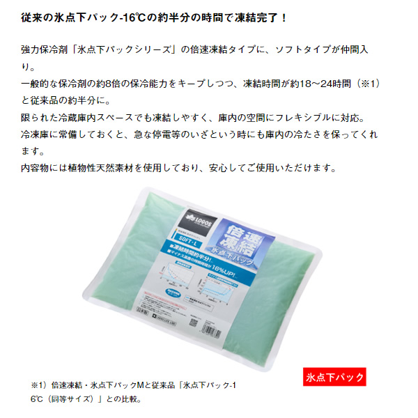 従来の氷点下パック-16℃の約半分の時間で凍結完了! 強力保冷剤「氷点下パックシリーズ」の倍速凍結タイプに、 ソフトタイプが仲間入り。 ■総重量:(約)900g ■サイズ:(約)縦19×横26×厚さ2.5cm ■主素材: [容器]ポリエチレン [内容物]植物性天然高分子 ■性能/特長: ・強力保冷剤「氷点下パックシリーズ」の倍速凍結タイプ ・従来の氷点下パック-16℃の約半分の時間で凍結完了 ・冷凍時に冷凍庫内スペースを確保しやすいソフトタイプ ・内容物は安心の植物性天然高分子 ・冷凍庫に常備で急な停電も安心!いざという時にも庫内の冷たさを保ってくれます。 ・日本製 ※素材の特性により粘度には個体差がありますが性能に問題はありません。 ※記載は商品仕様の一部です。仕様説明不足等の理由での返品はできません。特に適合等は必ずご確認ください。