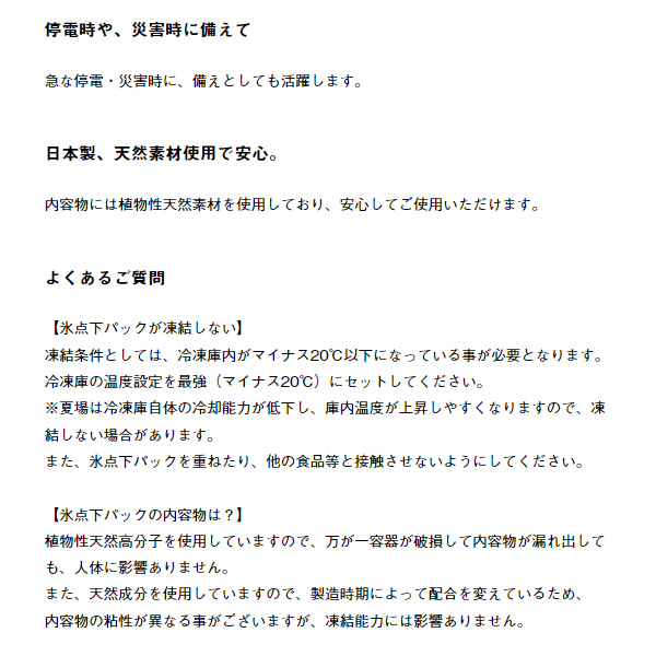 ・冷凍庫に常備で急な停電も安心!いざという時にも庫内の冷たさを保ってくれます。