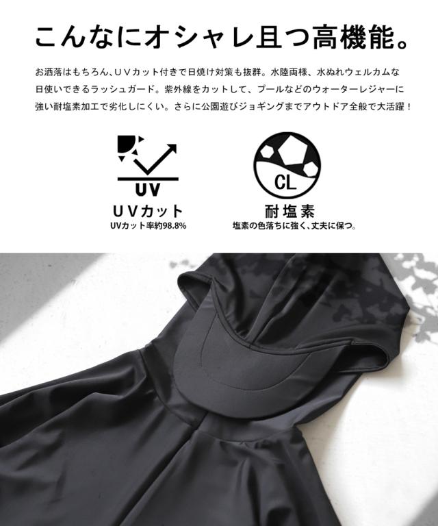 「UVカット」「耐塩素」機能付き、フード付きラッシュガード