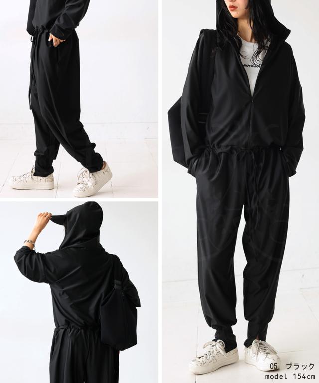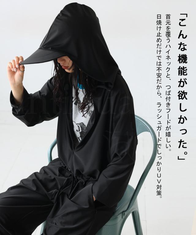 pn-00391 水陸両用 UVカット 日焼け防止 耐塩素 無地 長袖 長ズボン ゆったり ハイネック フード つば付き フーディー フロントジップ ファスナー ジップアップ ポケット付き
