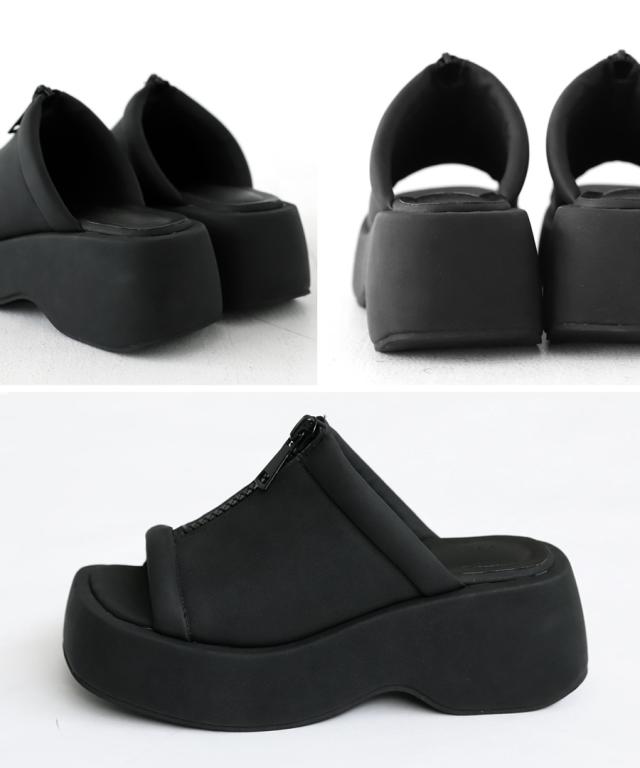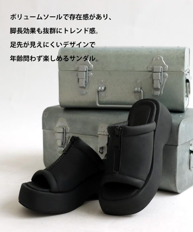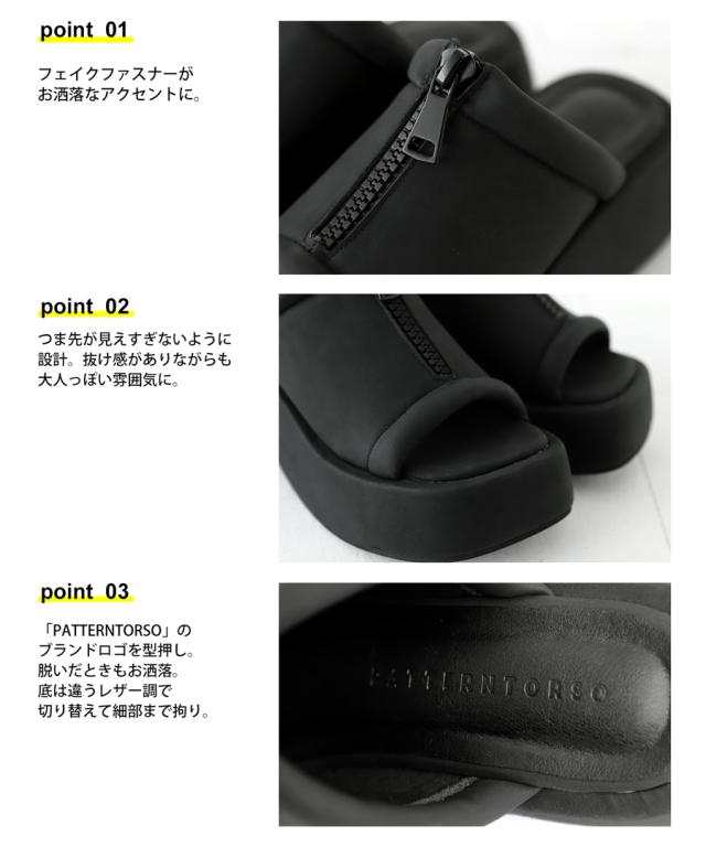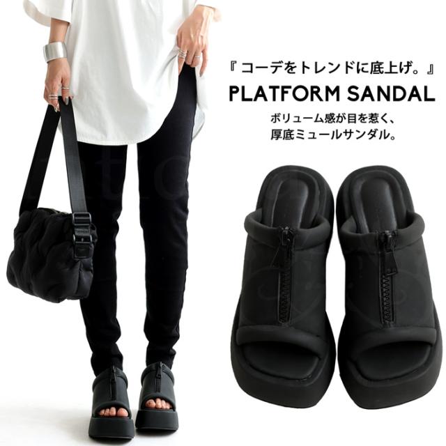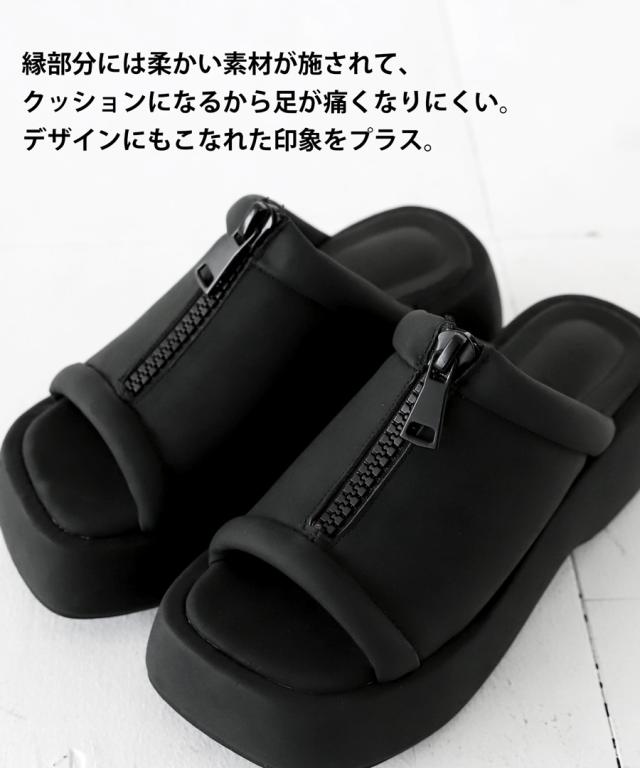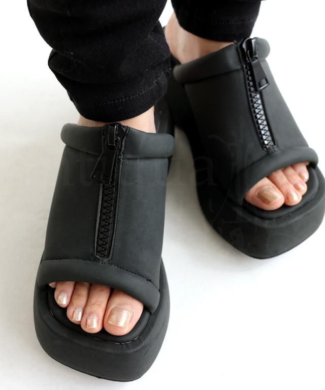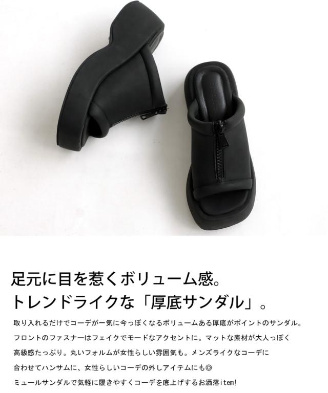 pg-00007 痛くない 歩きやすい オープントゥ 厚底サンダル ミュール ボリューム フェイクファスナー モード 高級感 シボ感 マット 合皮 オープントゥサンダル 黒 ブラック シューズ