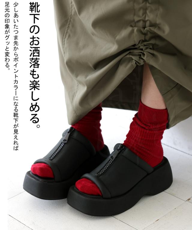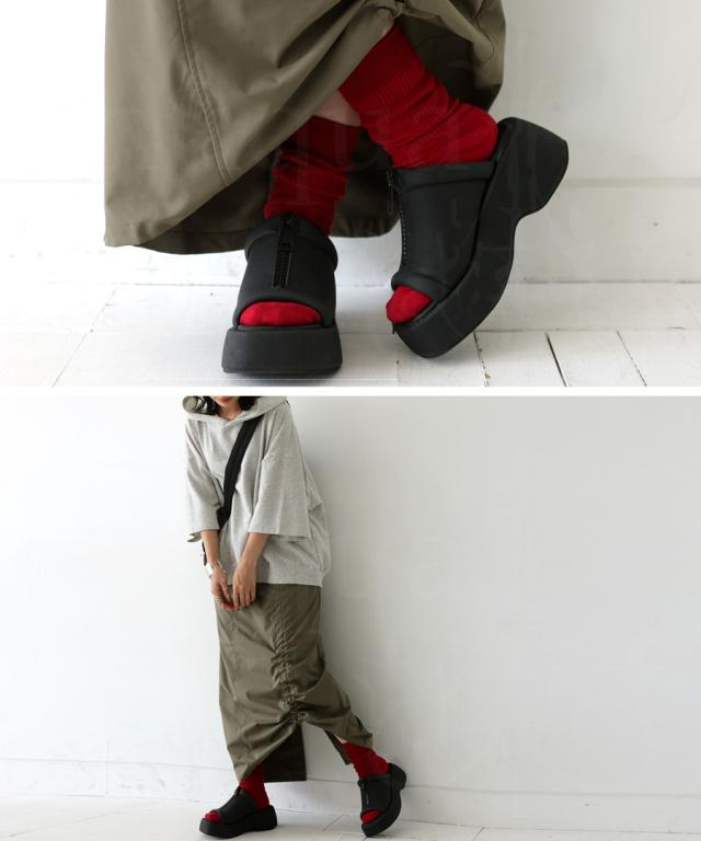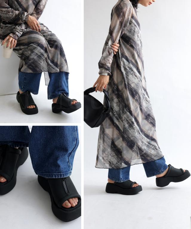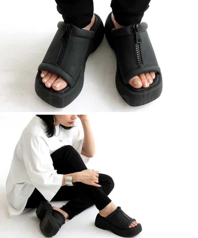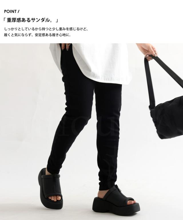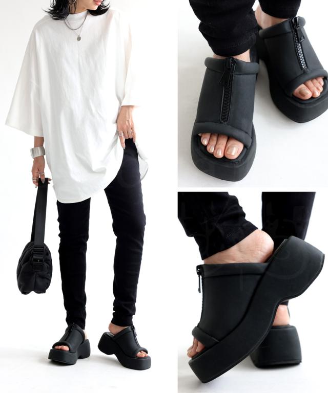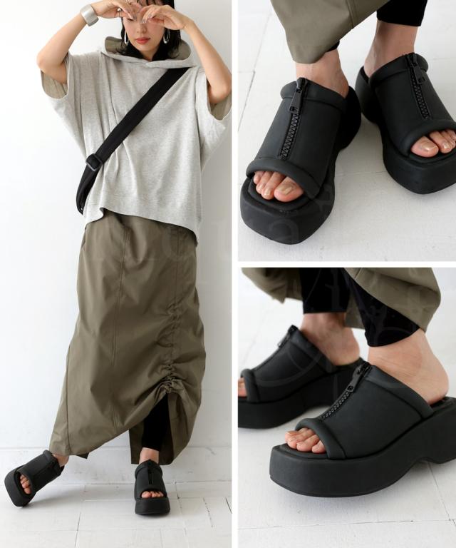 pg-00007 痛くない 歩きやすい オープントゥ 厚底サンダル ミュール ボリューム フェイクファスナー モード 高級感 シボ感 マット 合皮 オープントゥサンダル 黒 ブラック シューズ