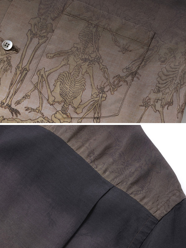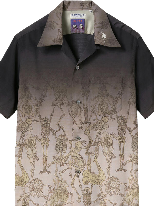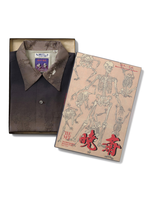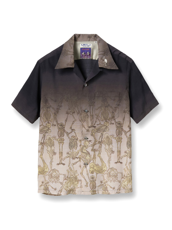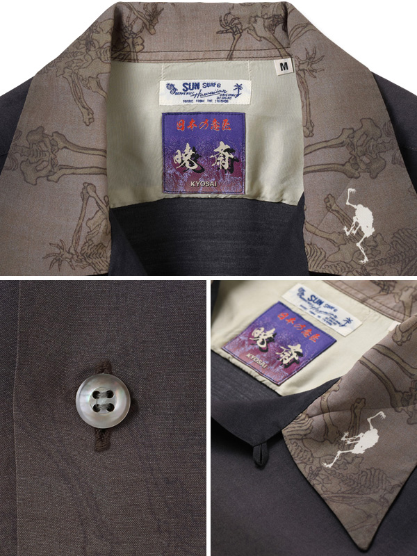 SUN SURF × KYOSAI SPECIAL EDITION GAKIKYOSAI Aloha SHIRT サンサーフ × 河鍋暁斎 スペシャルエディション 画鬼狂斎 アロハシャツ 【SPECIAL EDITION(スペシャルエディション)】 楽園ハワイを象徴するアロハシャツ。 その発祥には日系移民が深く関わっており、トロピカルな柄だけでなく和柄もヴィンテージとして存在する。 ハワイが観光地として確立した20世紀半ばには、お土産物としてアロハシャツの需要が一気に増加。 デザインやパターンが多様化し、多くの作品が生まれた。 ヴィンテージのアロハシャツを収集する過程で、ごく稀に出会える特別な逸品。 時代の流れと友に失われつつあるそれらの作品を生み出したテキスタイルデザイナーに敬意を表し、 多色の贅沢なプリントの迫力のデザイン、メーカーや年代によって異なる各部のディテールまでその魅力を余すところなく完全再現する。 それがサンサーフ・スペシャルエディション。 幼少期より様々なものを観察し、スケッチしてきた河鍋暁斎(かわなべきょうさい)。 多作の絵師としても知られ、風刺画の他にも絵画や版画など幅広いジャンルの作品を手掛けた。 また、明治時代の前期まで盛んに行われていた「書画会」と呼ばれる展示会にも多くの作品を出品し、精力的に活動。 そしてこのシャツの題材にもなっている「暁斎漫画」を1881年に出版することとなる。 享年57再という短い人生ではあったが、師匠たちをも唸らせるデッサン力と奇抜な発想によって 描き出された戯画や漫画の数々は、現代のアニメーションや漫画の基礎を作ったとされ、多くの支持を受けている。 こちらのデザインではブラックを基調とし、全体的に落ち着いた色のグラデーションを駆使して「暁斎漫画」をプリント。 暗闇から骸骨が浮かび上がる様をアロハシャツに表現した。 様々なポーズをとり、躍動感あふれるタッチで描かれた骸骨たちが立ち並ぶ情景は見る者に強烈な印象を残す。 | ||||||||||||||||||||||||||||||||||||