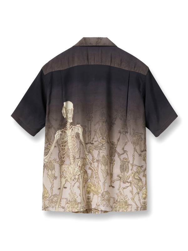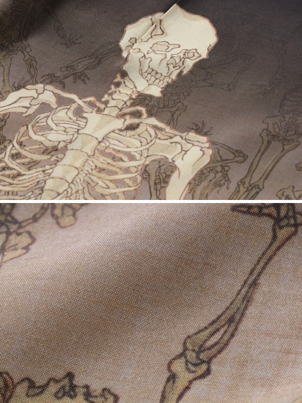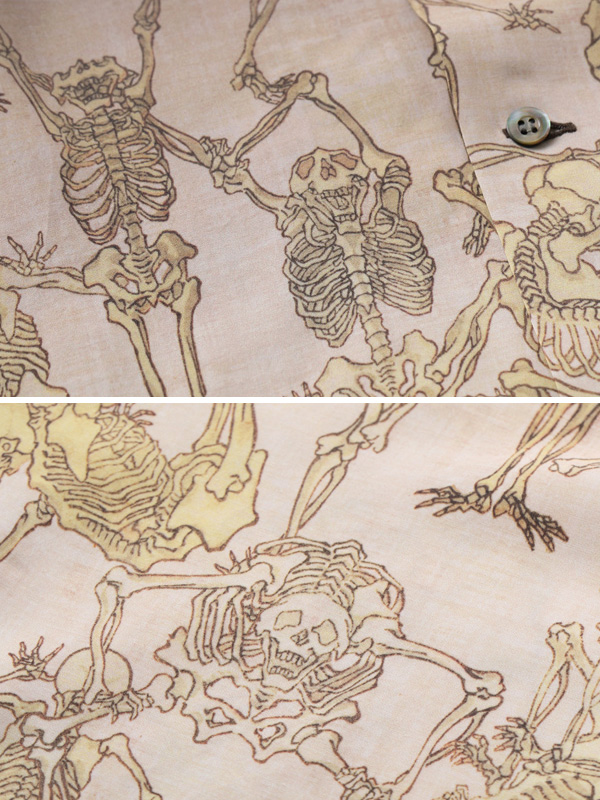 暗闇から骸骨が浮かび上がる様をアロハシャツに表現した。