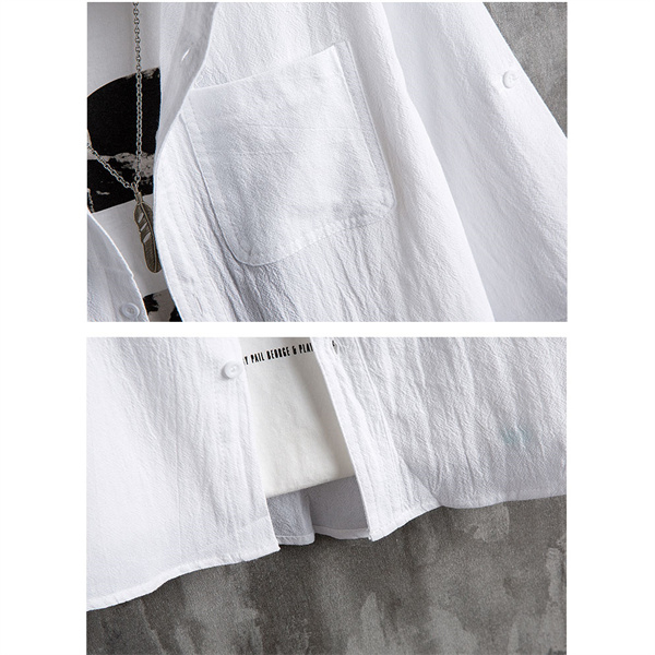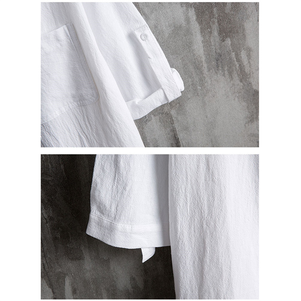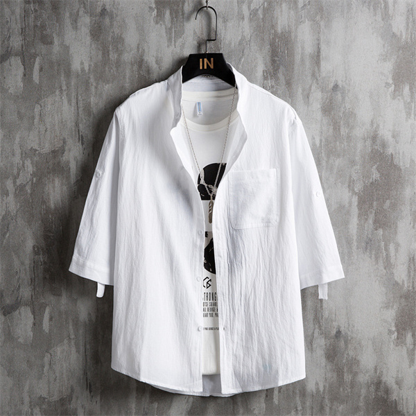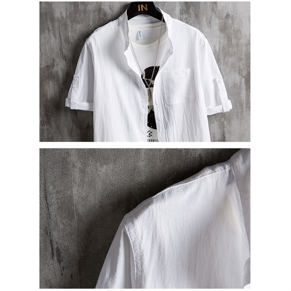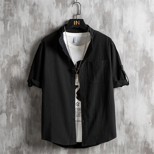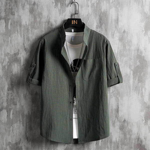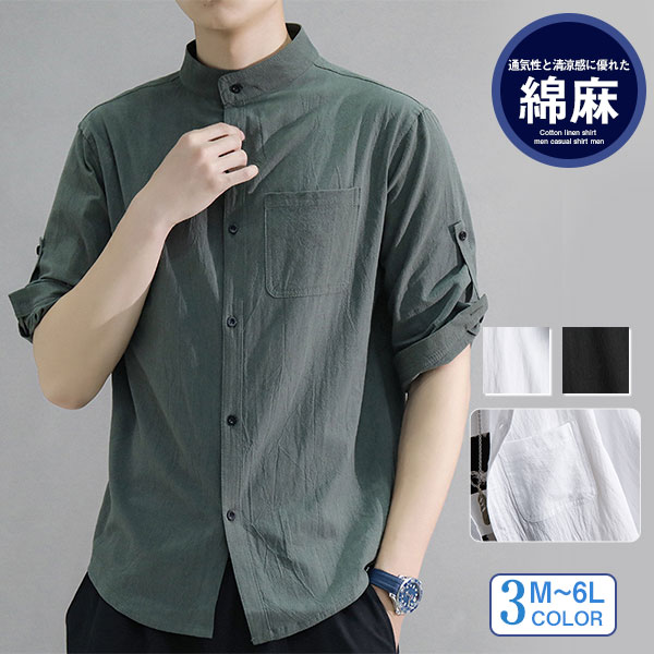 ポイント超超祭 綿麻シャツ メンズ シャツ カジュアルシャツ 胸ポケット付き 五分袖 春夏秋トップス 開襟シャツ 立ち襟 通勤 プルオーバー メンズファッション