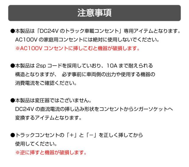 ※本製品は「DC24Vのトラック車載コンセント」専用アイテムとなります。家庭用コンセントのAC100Vには危険ですので絶対に使用しないでください。 ※本製品は2sqコードを採用しており、10Aまで耐えれる構造となりますが、車両側の出力や使用する機器の消費電力により異なります。 ※本製品は変圧器ではございません。DC24Vの直流電気の差し込み形状をコンセントからシガーソケットに変換するアイテムとなります。 ※トラックコンセントの「+」と「-」を正しく接続して使用してください。(逆に接続した場合は機器が破損する恐れがあります。 ※上記を守らなかった場合に生じた一切の責任は負いかねます。 |