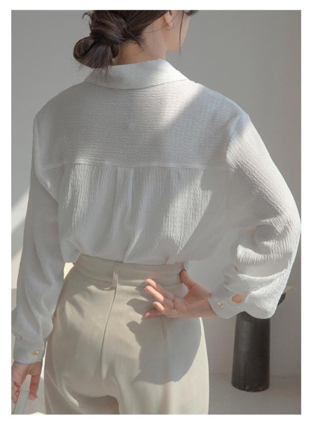 | 広めに開いたネックラインが大人可愛い開襟シャツ。 働く女性はカッコイイ、それと同時に可愛くありたい、ワイシャツならではのかっこよさと女性らしいデザイン性で働く女性の魅力を引き出します。 程良いハリ感がきれいなシルエットをキープします。 パンツにもスカートにも、綺麗めにもカジュアルにも合わせやすい。 襟抜き風に着こなしたり、ラフなライトアウターとして着こなすのもおすすめ。 着回し力もあり、ロングシーズンご愛用いただけるブラウスです。 | |