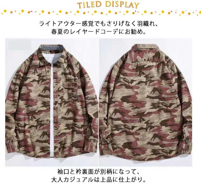 | 大人のカジュアル迷彩柄シャツ。 ライトアウター感覚でもさりげなく羽織れ、春夏のレイヤードコーデにお勧め。 袖口と衿裏面が別柄になって、大人カジュアルは上品に仕上がり。 一枚で着用頂けるのはもちろん、インナーとしてのアクセント使いもオススメ。 | |