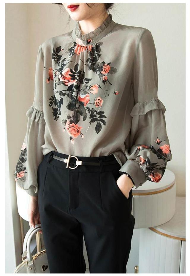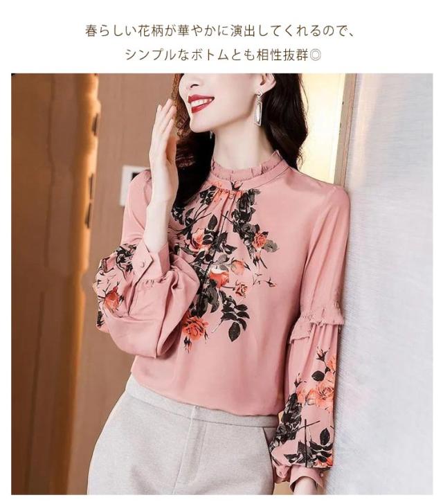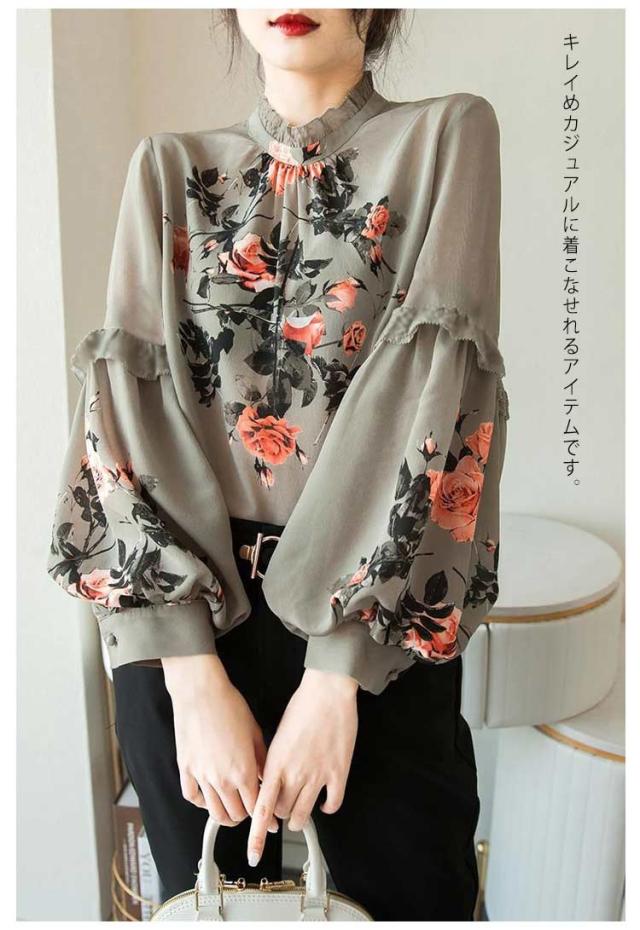 ブラウス 長袖 レディース ゆったり 春夏 夏 フリル襟 フリル 春 OL 30代 薄手 トップス フリル袖 シャツ 花柄 ハイネック トップス きれいめ チュニック 花柄ブラウス 大人 オフィス カジュアル 20代 ボリューム袖 40代 50代 ママ 母 ブラウス