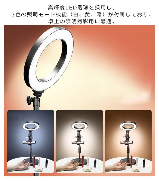 | スマホの固定は、縦横どちらの向きにも装着可能で、角度も向きも自由自在です。 高輝度LED電球を採用し、3色の照明モード機能(白、黄、暖)が付属しており、卓上の照明撮影用に最適。 ネイルや料理動画、お絵描きの動画、DIYなどの作業中の動画などの撮影などにもご利用頂けます。 360度の角度調整が可能で、横、縦、斜め、上下、自在に好きな位置にスマホをセットできます。 リング撮影ライト本体はUSB給電ポートが搭載し、LEDに給電できますのでとても便利です。 | |