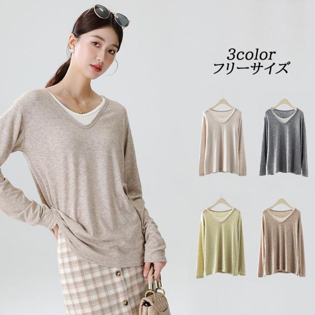カットソー レディース vネック 体型カバー 長袖 インナー チュールトップス シアートップス 無地