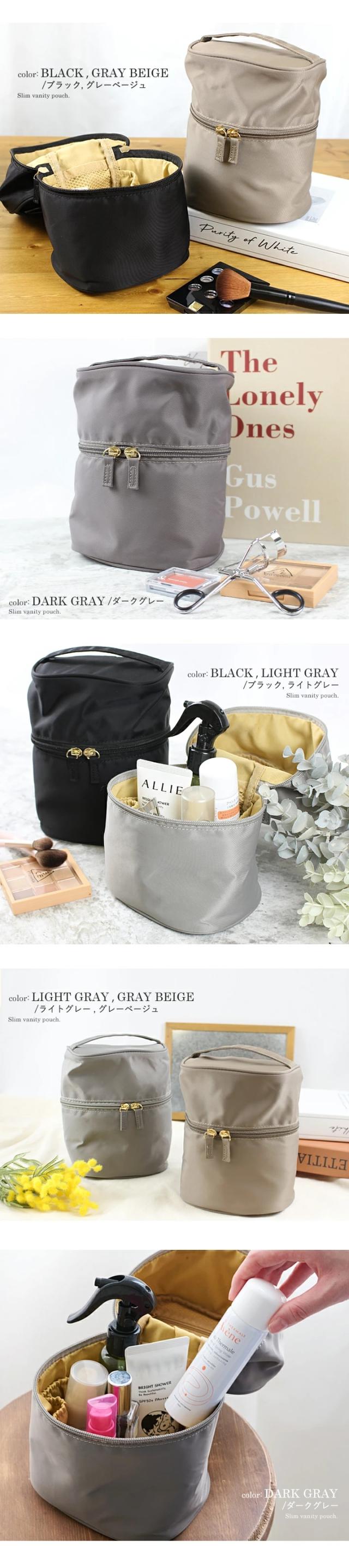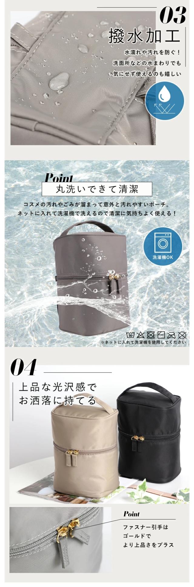 - しっかりした作りです。ダブルファスナーで開けしめが楽!縦に長くなっているので、ビンの化粧品もタップリ入るし、ポケットがたくさん付いているので、小さめの化粧品や小物が迷子にならず、助かります。
