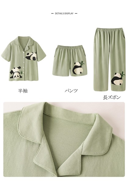 - この色は、あまり着たことはなかったんですが、パンダの可愛いい絵と笹をイメージした色合いでいいデザインだったので購入しました。生地も肌触りがよく、長ズボンと半パンの3点セットでパターンをかえてきれるのもオシャレですね。子供ぽっくないので大人のパジャマにはいいかと思います。