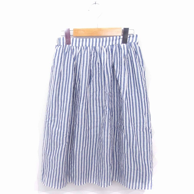【中古】シップス SHIPS フレア ギャザー スカート ストライプ 膝下丈 薄手 ブルー オフホワイト 青 白 /TT38