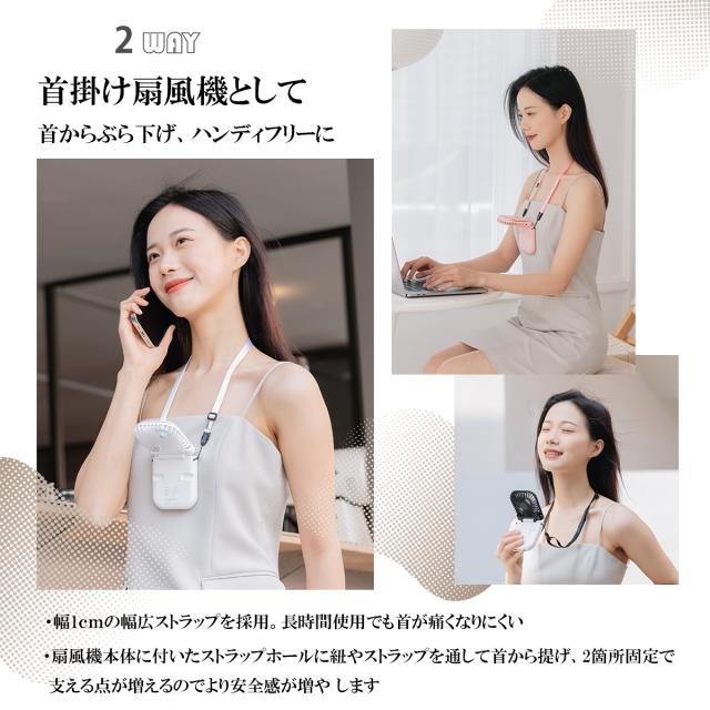 ・付属している専用ストラップを首から提げ、ヘッド部分を上向きにすれば首掛け扇風機として使用可能!