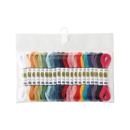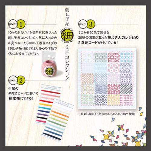 商品詳細:自分に合う色を少量で試せる!付属のカードに巻いて見本帳にできます。全色で刺せる花ふきんの図案(2次元コード)付きです。 生産国:日本 重量:約49g セット内容:刺し子糸(細)ミニかせ20色(1かせ約10m/綿100%)糸巻きカード2枚花ふきんレシピの2次元コード