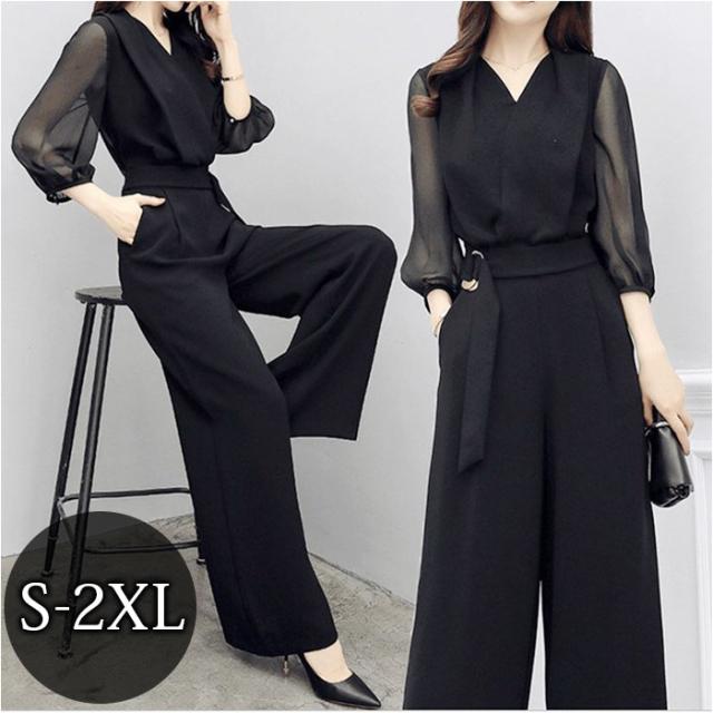 パーティードレス パンツ 通販 パンツドレス レディース ドレス パンツスタイル オールインワン サロペット フォーマル パーティドレス 黒 ブラック ワイドパンツ 七分袖 ロング丈