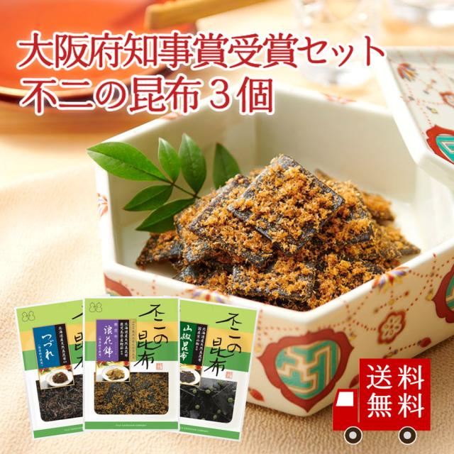 【送料無料】大阪府知事賞受賞セット 不二の昆布 3個【 P-2 】 ( 浪花錦 山椒昆布 つづれ ) 昆布佃煮 ご飯のお供 ふりかけ お弁当 おにぎり おつまみ お試し おうちごはん プチギフト 帰省土産 米 お米 送料無料 メール便 めーる便
