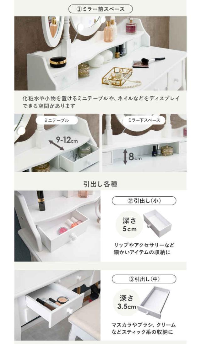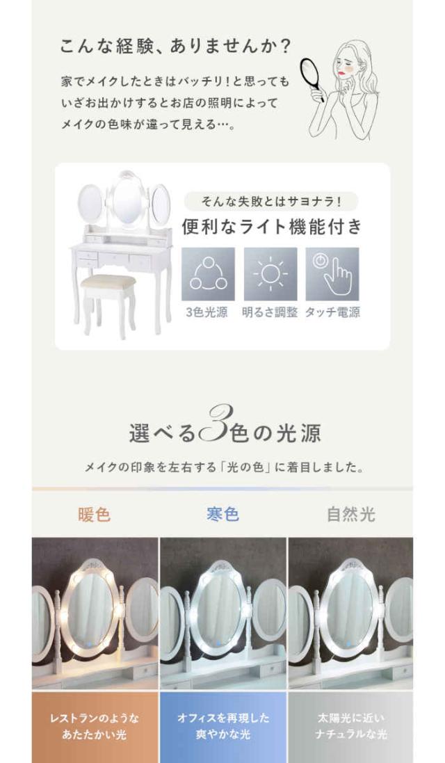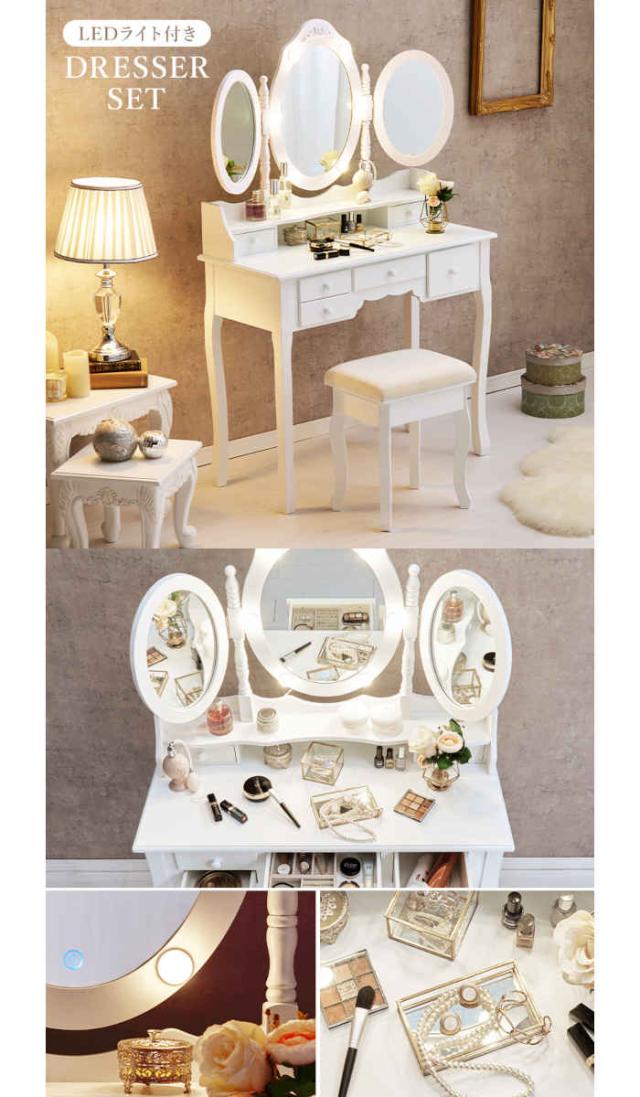 LEDライト付き 女優ライト付き スツール付 三面鏡 ドレッサー 鏡台 ミラー 鏡 化粧台 身だしなみ 身支度 インテリア 室内 部屋 寝室 新築 新居 新生活 新社会人 就職 新学期 進学 入学 引越し 引っ越し 引越 転居 転勤 単身赴任 一人暮らし ひとり暮らし 家具 模様替え 上品 エレガント エレガンス 優雅