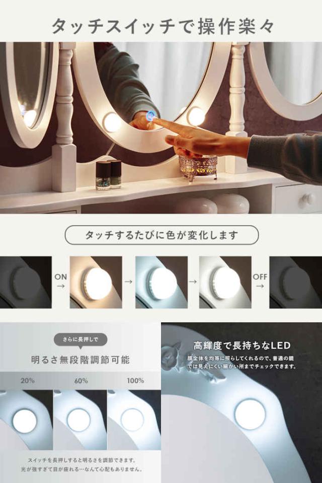 LEDの女優ライト付きのドレッサー。いろいろな角度からメイクやヘアスタイルを確認できる楕円形の三面鏡タイプ。上品な曲線脚のデザインを合わせたスツール付き。