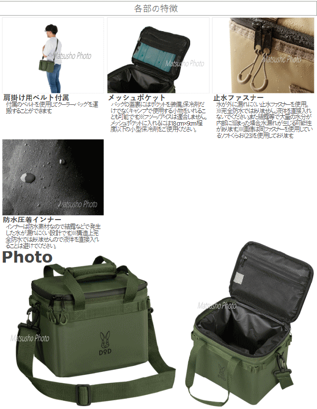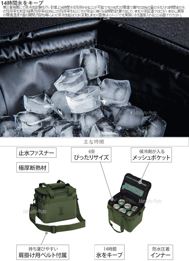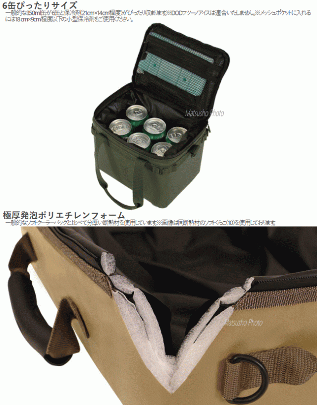 キンキンに冷えたドリンクで乾杯し一口目に口をつけた瞬間。くぅーーー!最高ッ!そんな最高の乾杯をお手伝いする350ml缶6缶と保冷剤がぴったり入るソフトクーラーです。バッグの蓋裏にはポケットを装備。保冷剤だけでなくキャンプで使用する小物をいれる事も可能です。一般的なソフトクーラーバッグと比べて分厚い断熱材を使用しています。■カラー:カーキ■サイズ約W24×D17×H20cm■インナーサイズ約W21×D14×H17cm■重量(付属品含む)約450g■材質[アウター]ポリエステル(ラミネートPVC)[断熱材]発泡ポリエチレン[インナー]PEVA■最大積載重量5kg■容量約4L■セット内容:製品本体、肩掛け用ベルト×1※フツーノアイスは適合しません。メッシュポケットに入れるには18cm×9cm程度以下の小型保冷剤をご使用下さい。