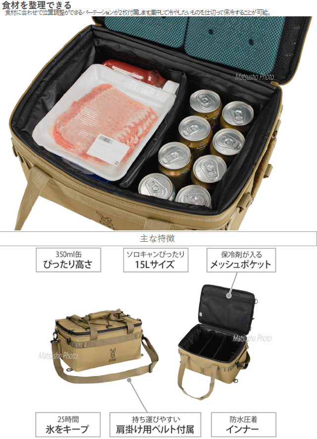ソロキャンプで使いやすい浅型ソフトクーラーです。ソロキャンプ用の食材が保冷剤と一緒に余裕を持って入ります。350ml缶の上に保冷剤を乗せるとぴったり収まる高さ設計です。一般的なソフトクーラーバッグと比べて分厚い断熱材を使用しています。食材に合わせて位置調整ができるパーテーションが2枚付属します。集中して冷やしたいものを仕切って保冷する事が可能。■カラー:タン■サイズ約W41×D29×H21cm■インナーサイズ約W36×D26×H18cm■重量(付属品含む)約1.3kg■材質[アウター]ポリエステル(ラミネートPVC)[断熱材]発泡ポリエチレン[インナー]PEVA■最大積載重量15kg■容量約15L■セット内容:製品本体、肩掛け用ベルト×1、パーテーション×2