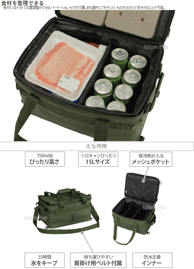 ソロキャンプで使いやすい浅型ソフトクーラーです。ソロキャンプ用の食材が保冷剤と一緒に余裕を持って入ります。350ml缶の上に保冷剤を乗せるとぴったり収まる高さ設計です。一般的なソフトクーラーバッグと比べて分厚い断熱材を使用しています。食材に合わせて位置調整ができるパーテーションが2枚付属します。集中して冷やしたいものを仕切って保冷する事が可能。■カラー:カーキ■サイズ約W41×D29×H21cm■インナーサイズ約W36×D26×H18cm■重量(付属品含む)約1.3kg■材質[アウター]ポリエステル(ラミネートPVC)[断熱材]発泡ポリエチレン[インナー]PEVA■最大積載重量15kg■容量約15L■セット内容:製品本体、肩掛け用ベルト×1、パーテーション×2