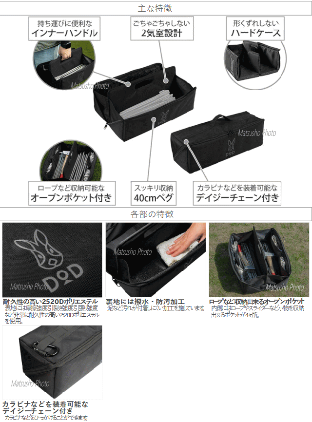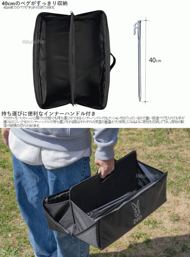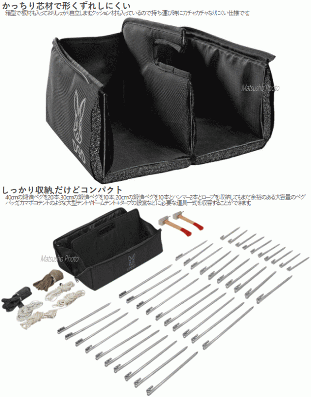 ペグを取り出しやすいようにファスナーをパッカーーンと開ける事ができます。大きく開くので必要なものがすぐ見つかります。ペグの長さや種類に応じて分ける事が出来る2気室仕様。40cmまでのペグがすっきり収納できます。ファスナーをパッカーーンと開けた状態でも持ち運びができるインナーハンドル付き。クッション材入りなので重い鍛造ペグを入れても手が痛くなりにくい。箱型で板材も入っておりしっかり自立します。クッション材も入りなので持ち運び時にカチャカチャなりにくい仕様。40cmの鍛造ペグを20本、30cmの鍛造ペグを10本、20cmの鍛造ペグを10本とハンマー2本とロープを収納してもまだ余裕のある大容量のペグバッグ 。カマボコテントの様な大型テントやドームテント+タープの設営等に必要な道具一式を収容する事ができます。■カラー:ブラック■サイズ約W46×D16×H16cm(ハンドル部分を除く)約W46×D16×H19cm(Hはハンドル部分を含む)■重量(付属品含)約900g■静止耐荷重各気室5kg(合計10kg)■セット内容:製品本体※ペグ等は付属しておりません。