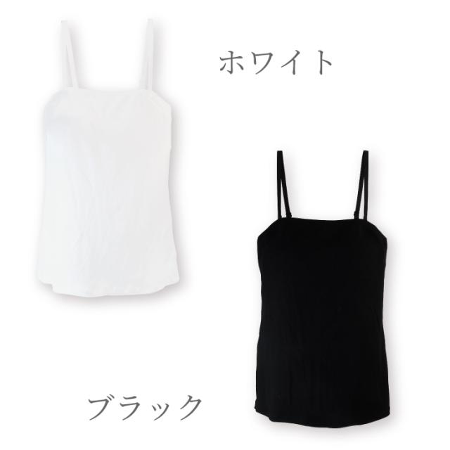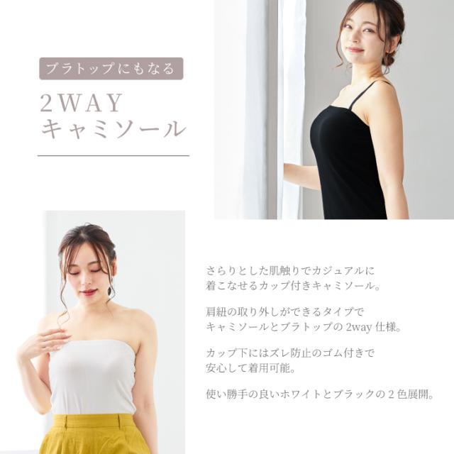 さらりとした肌触りでカジュアルに着こなせるカップ付きキャミソール。肩紐の取り外しができるタイプでキャミソールとブラトップの2way仕様。カップ下にはズレ防止のゴム付きだから安心。カップ付きキャミソールだからブラをつけずらくちんに過ごせる1着。使い勝手の良いホワイトとブラックの2色展開。