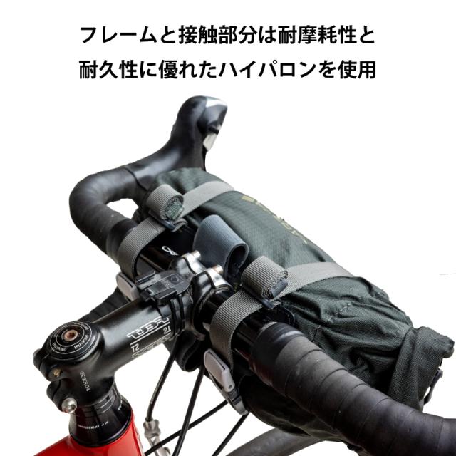 小さいながらも最大2Lの収納が可能です。 バッグの周囲・底面にはパッドが入っており、荷物を守ってくれます。 余分は切って調整可能な固定テープなのでどんな自転車にも対応可能です。 縫い目は強度の高いバータックステッチで施されているので、激しい動きや過酷な環境でも破れにくいです。 |