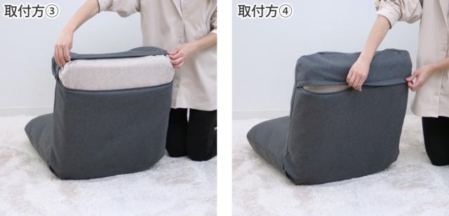 | カバーの端を座椅子の足元に入れ込みます。 | ファスナーを閉めます。 |