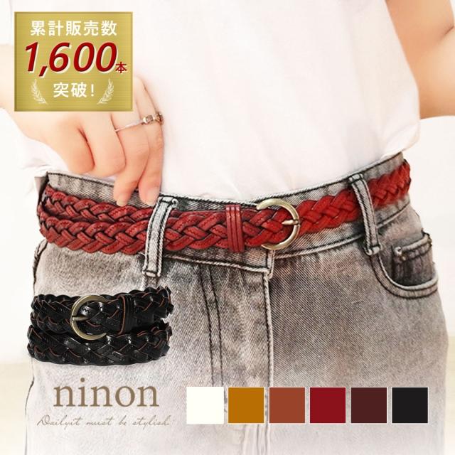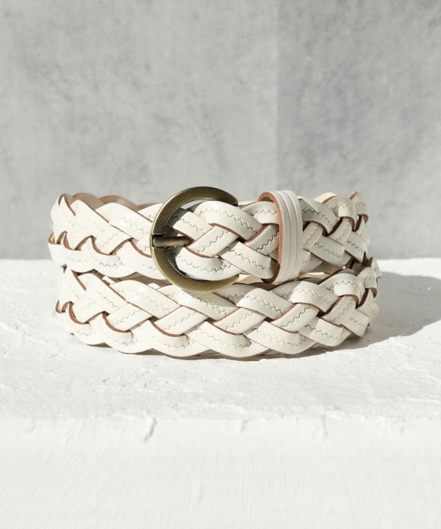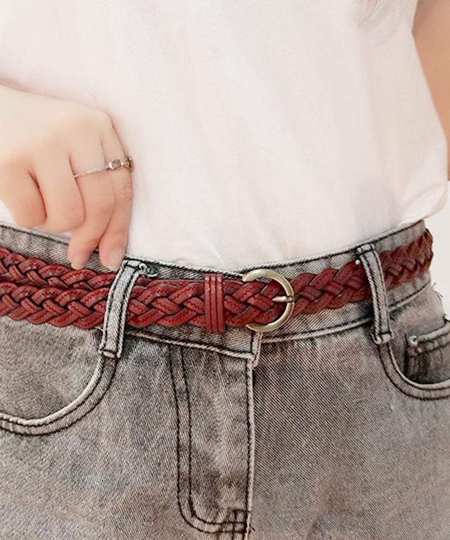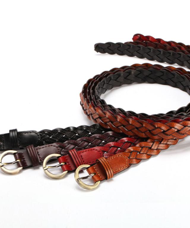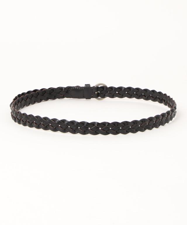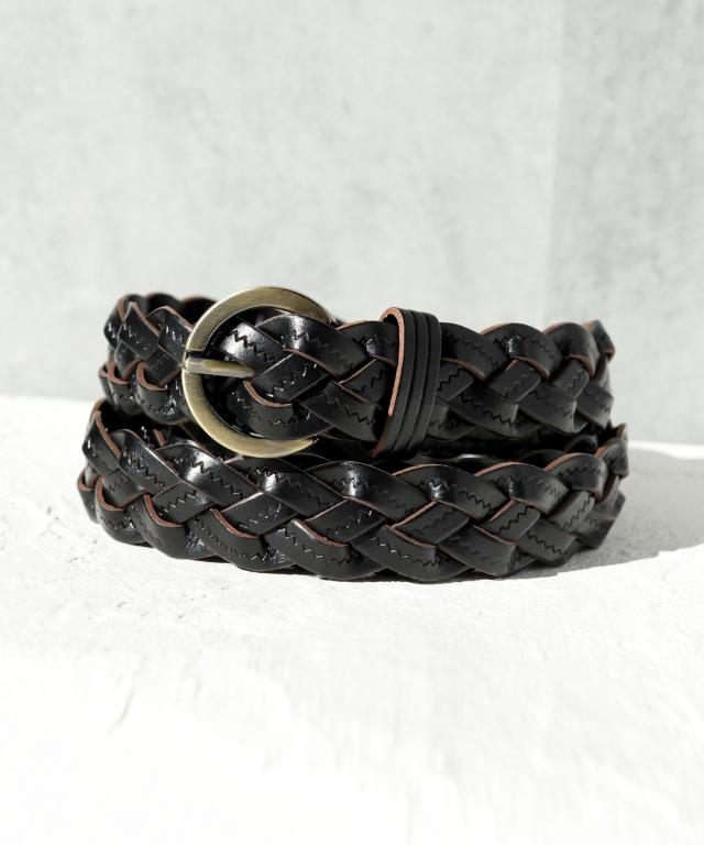 【本革/無段階調節/ラウンドバックル編み込みメッシュ細ベルト】