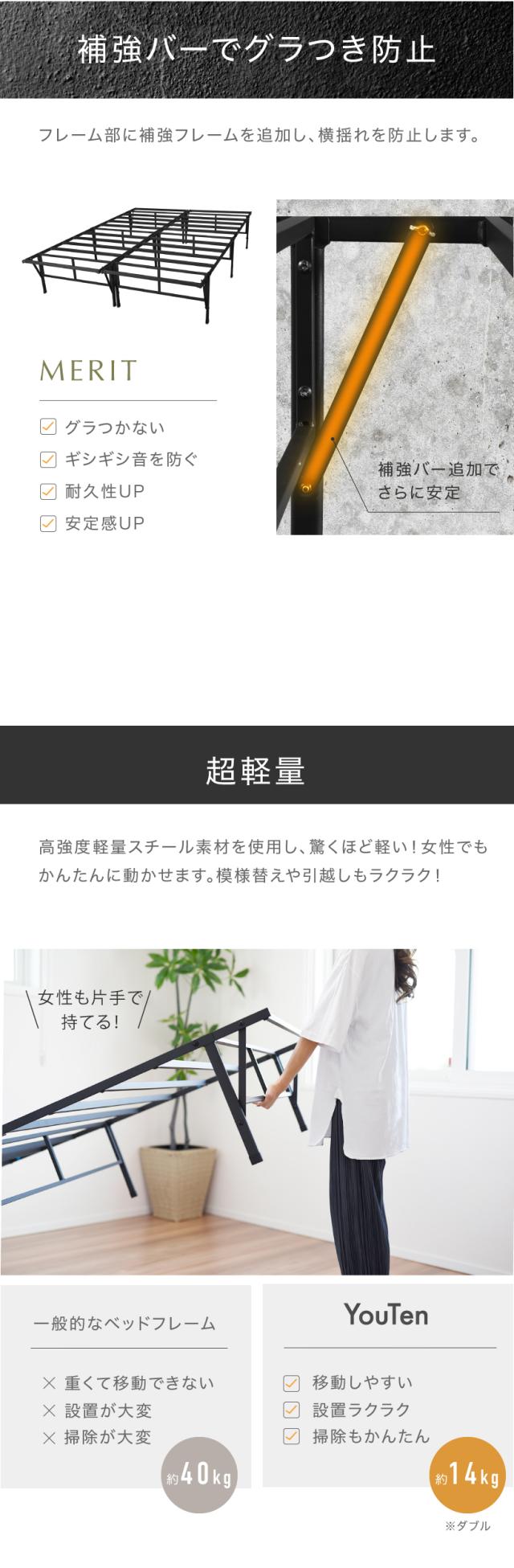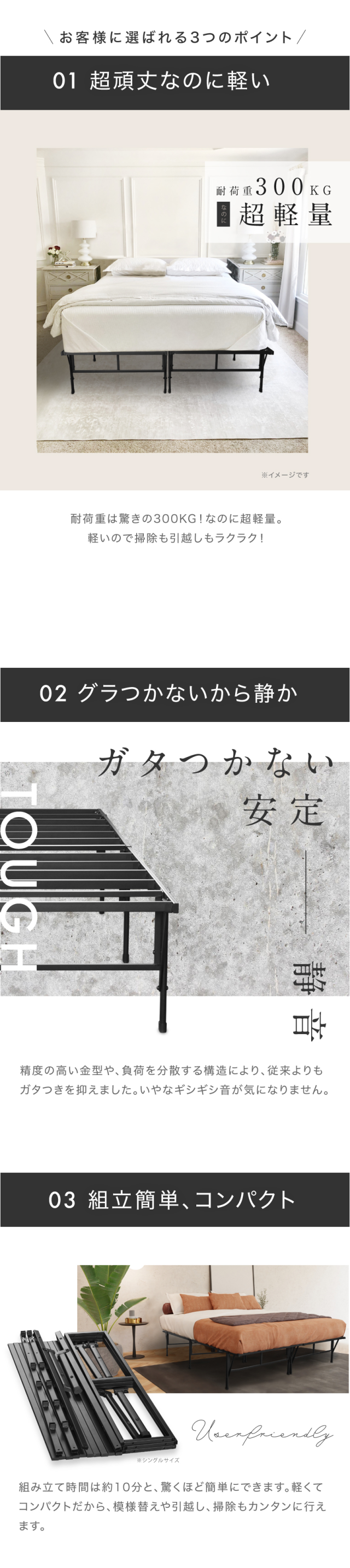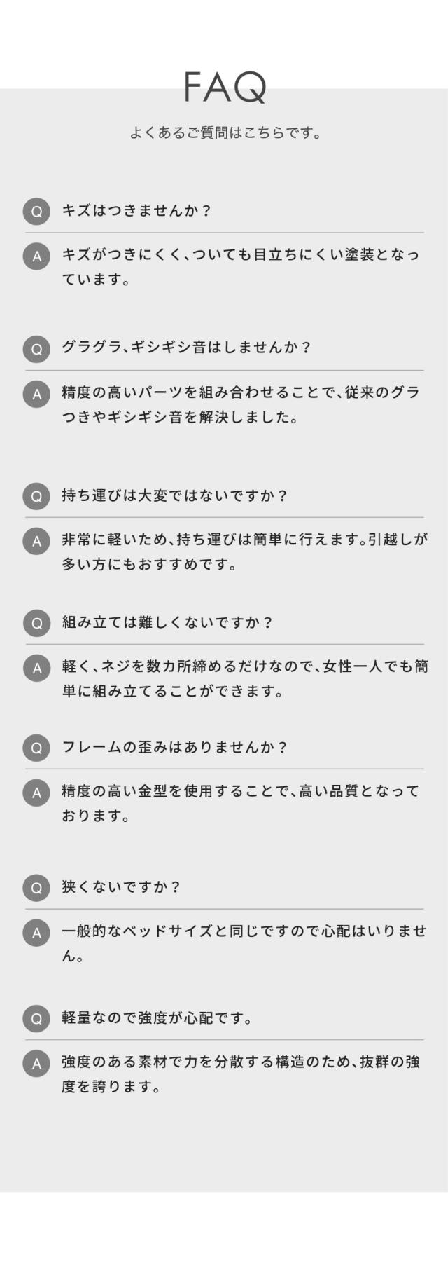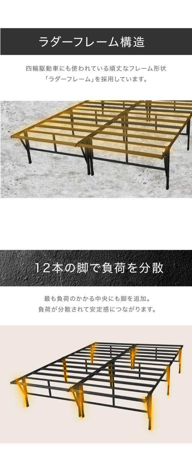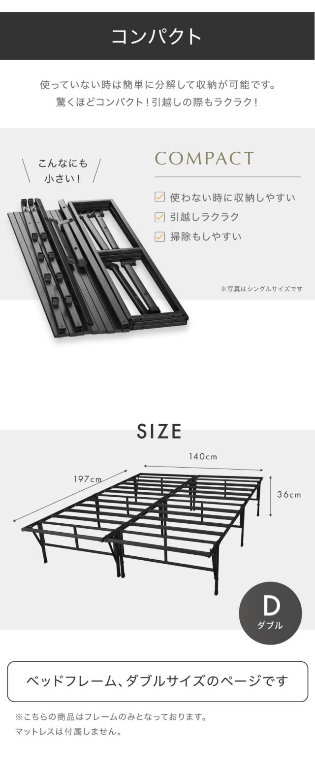 - マットレスだけで寝ており、引越しを気にフレームをずっと探していました。 すのこタイプのベッドと悩んでカビなどの対策、重さの事を考えこちらを購入。 注文してすぐに届きました。 到着してすぐ組み立てている最中に部品に不備があり連絡した所すぐに対応してくれました。 届いてから1週間後にようやくベッドが完成し、使い心地は……。ギシギシ音がしません。 移動させるのもダブルベッドですが1人で出来ます。 ベッド下も衣装ケースが楽に入り収納スペースが増えました。 買って良かったです。毎日快適に寝ています。