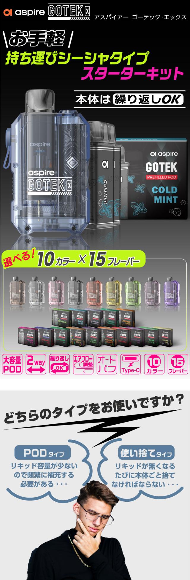 ![]() | ⇒Aspire GOTEK PRO(アスパイア ゴーテック プロ)持ち運びシーシャタイプスターターキットはコチラ 進化したGOTEK!大人気Aspire GOTEKのリキッド入りカートリッジがセットになったお得なスターターキット。 |