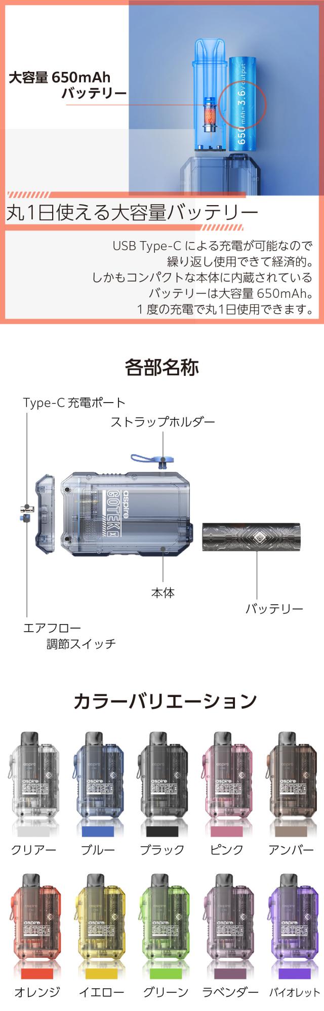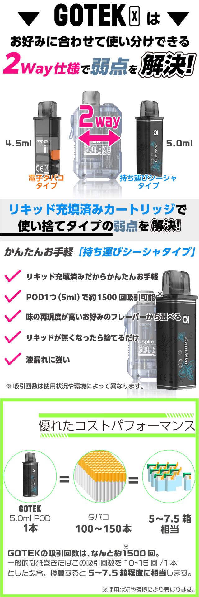 Aspire GOTEK X 持ち運び シーシャ 電子タバコ ベイプ POD スターターキット 本体 電子タバコ タール ニコチン0 アスパイア ゴーテックX ポッド 水蒸気 電子 おすすめ 電子タバコ VAPE ベイプ リキッド 爆煙 禁煙 ニコチンゼロ ノンニコチン ニコチンフリー コンパクト