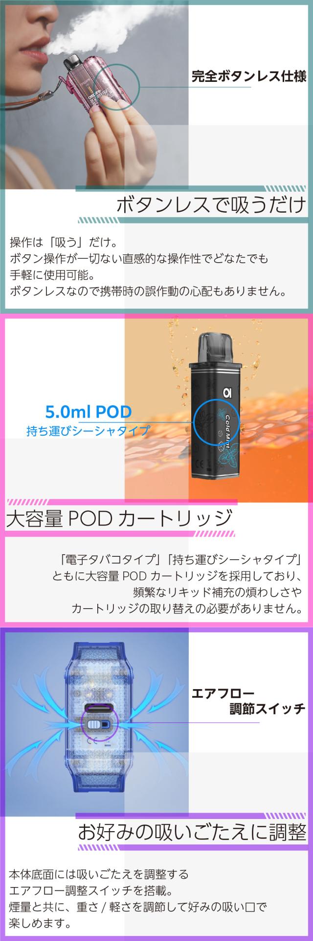 本体はお好みに合わせて使い分けできる2Way仕様のPOD型VAPE(ベイプ)となっており、別売りの空カートリッジにお好みのリキッドを注入して圧倒的コスパの「電子タバコタイプ」としての使用はもちろんのこと、付属のリキッド充填済みのカートリッジ※でかんたんお手軽「持ち運びシーシャタイプ」としても使用できる次世代型の画期的な電子タバコとなっております。