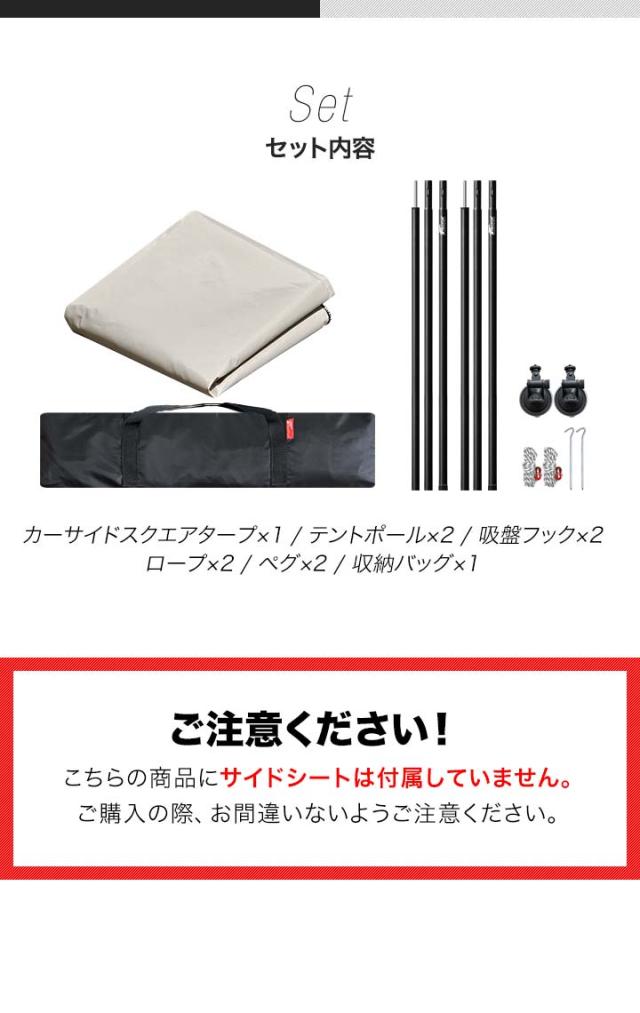 | 付属品: ・タープ×1 ・テントポール×2 ・吸盤フック×2 ・ペグ×2 ・ロープ×2 ・専用収納バッグ×1 ・取扱説明書(日本語) |