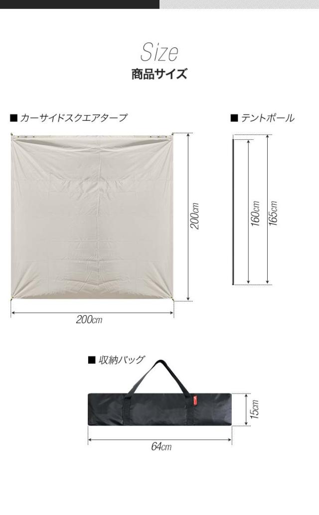 | サイズ: 本体サイズ : (約)200cm×200cm ポール連結時 : (約)直径1.6cm×165cm(有効長 : (約)160cm) 収納時 : (約)64cm×15cm×15cm |