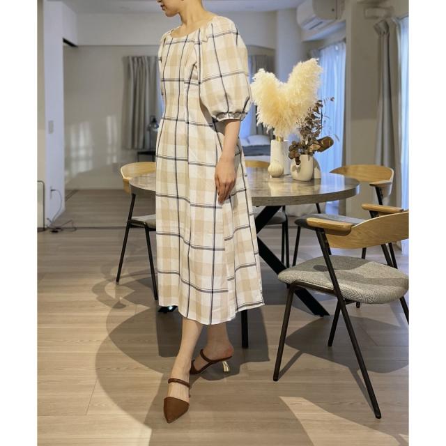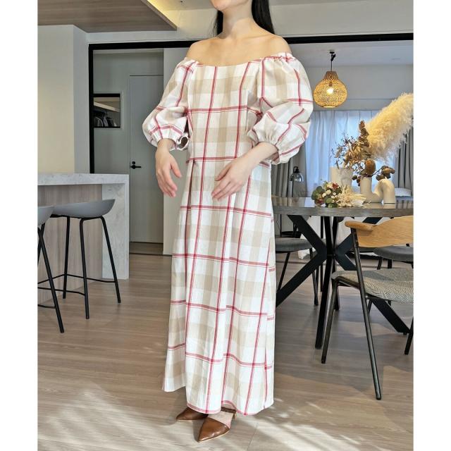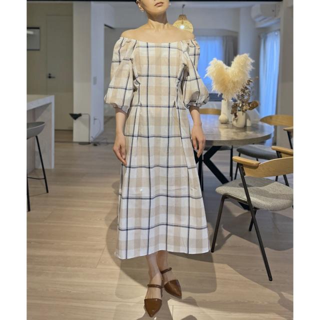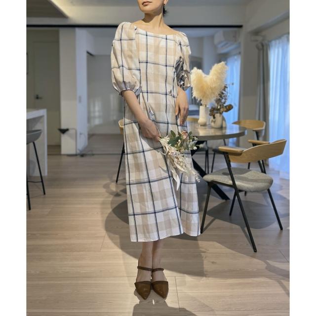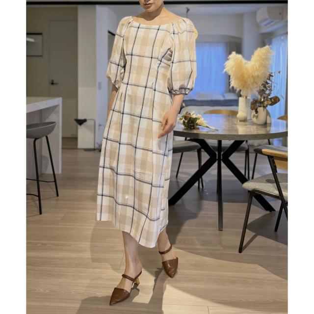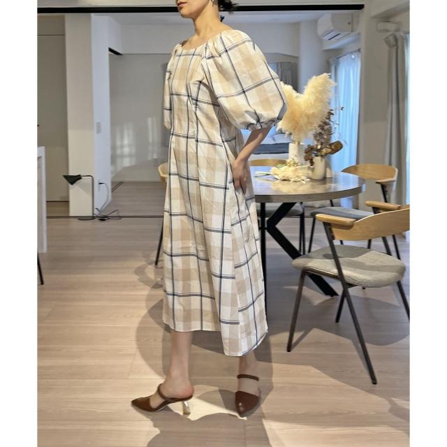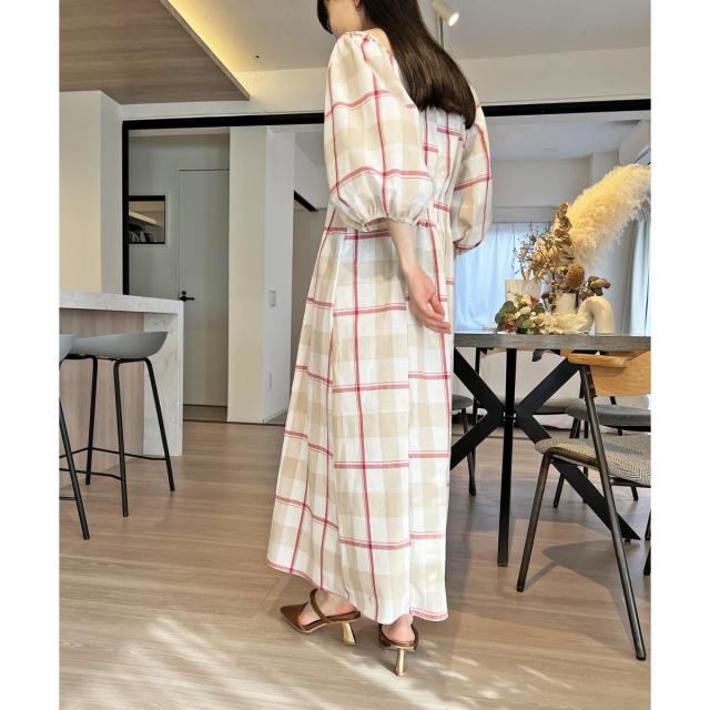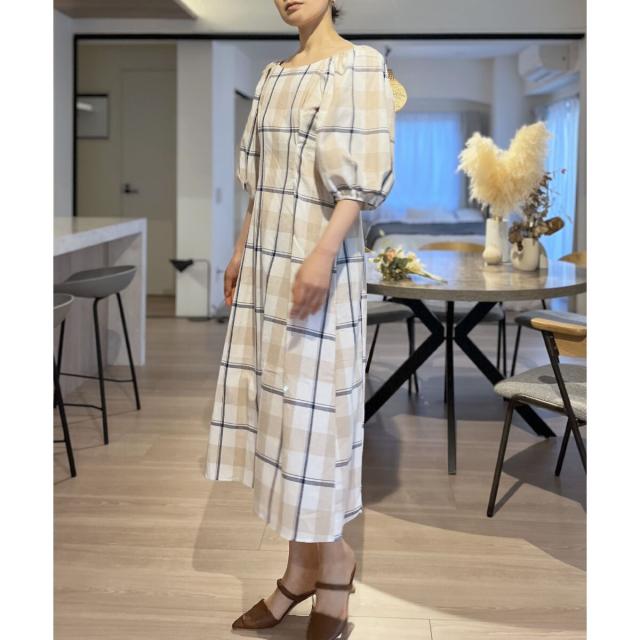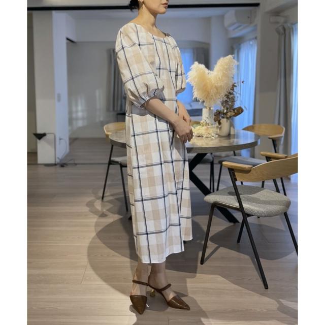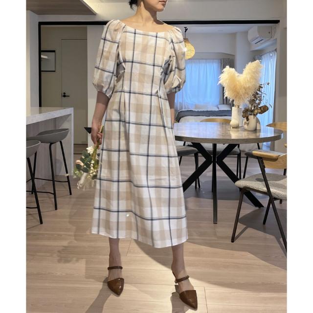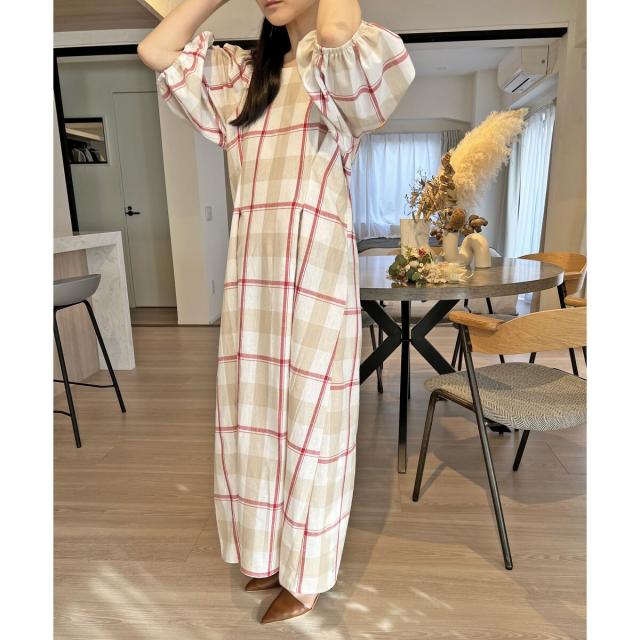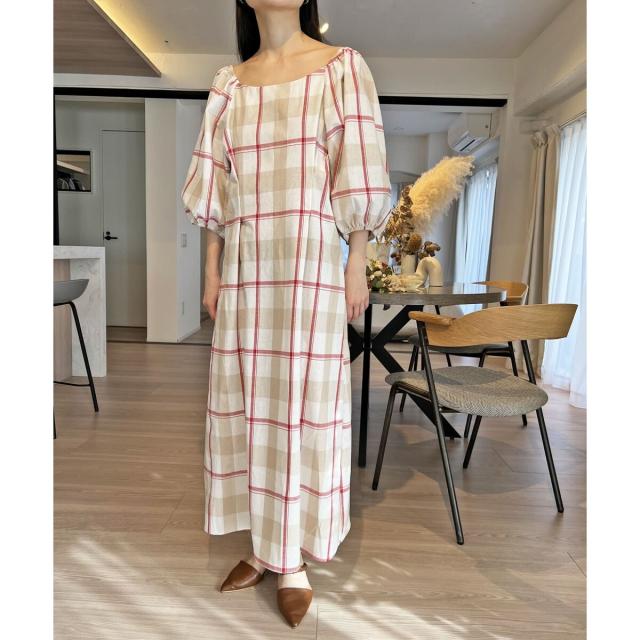 ボリュームスリーブチェックロングワンピース