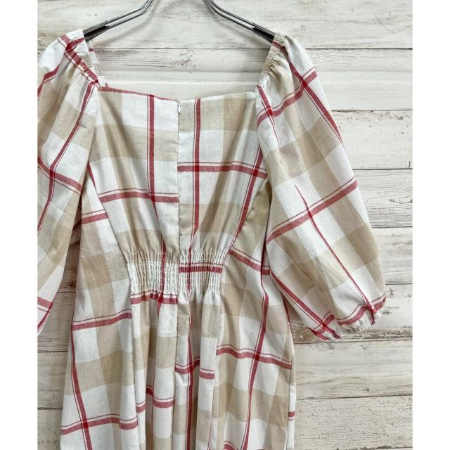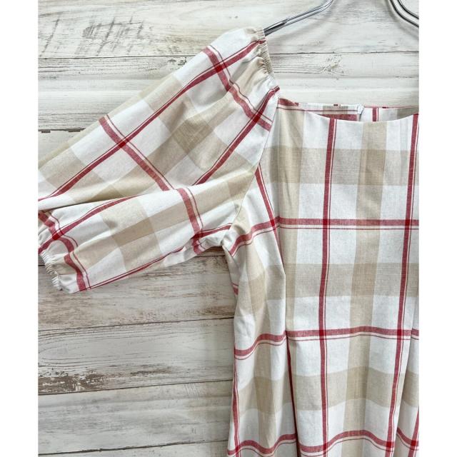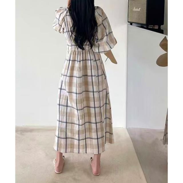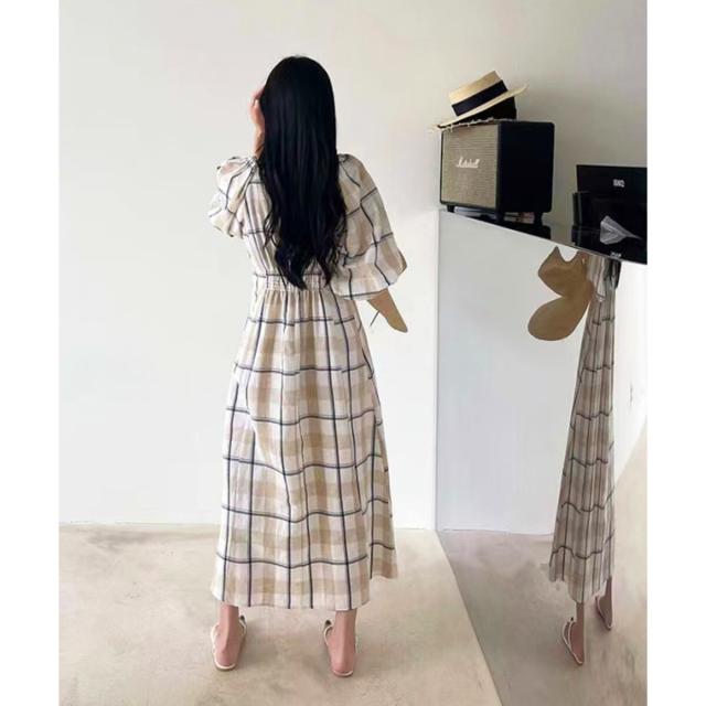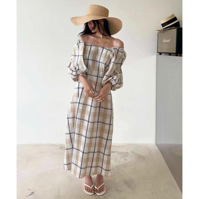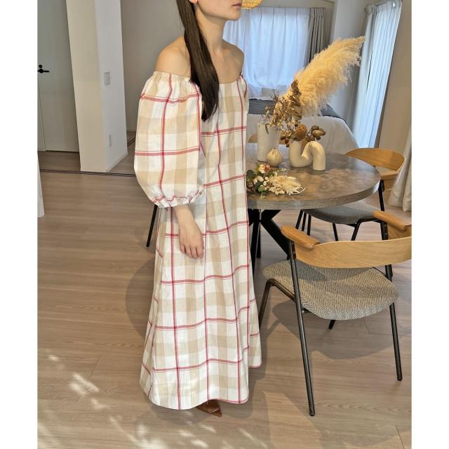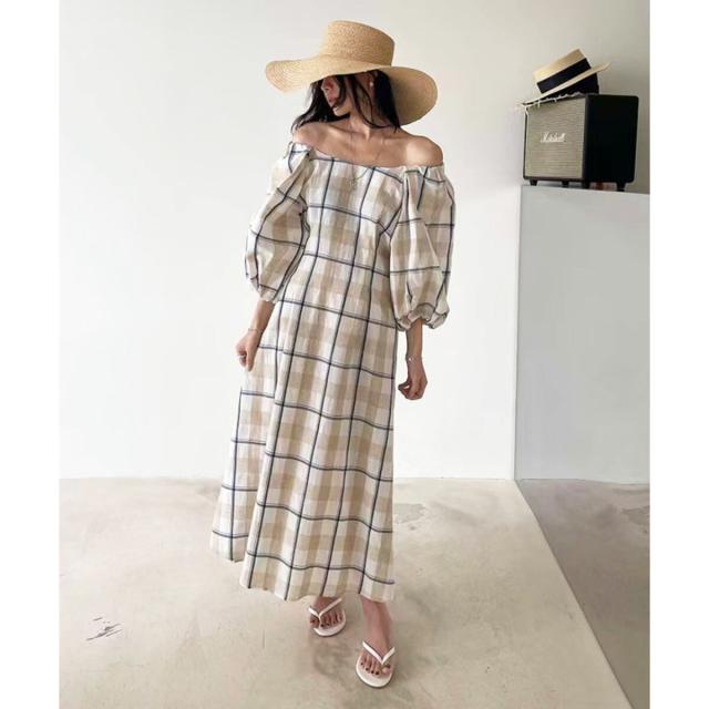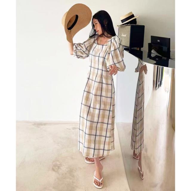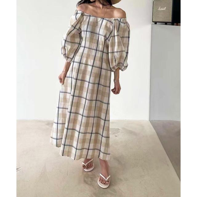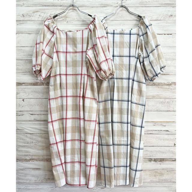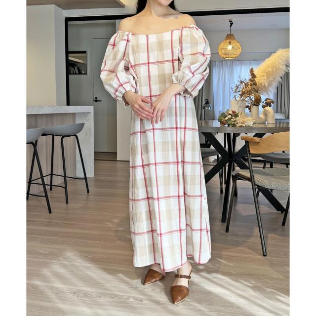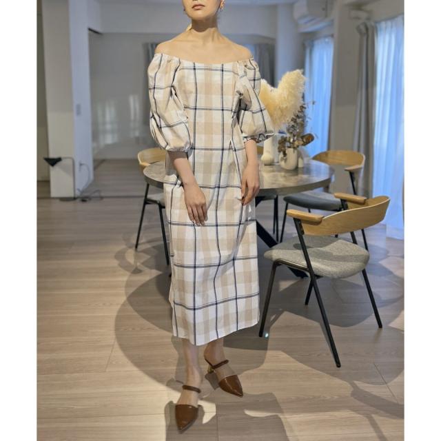 ボリュームスリーブチェックロングワンピース