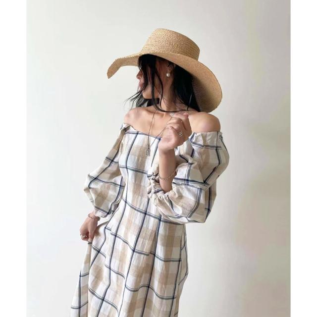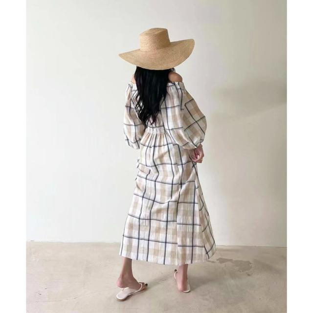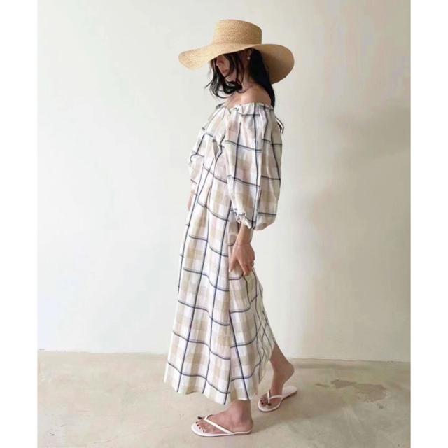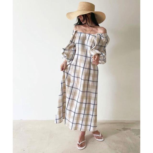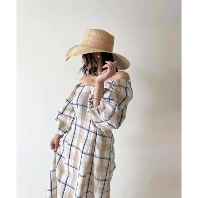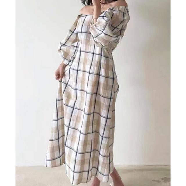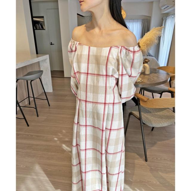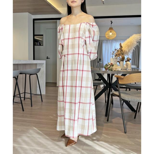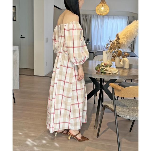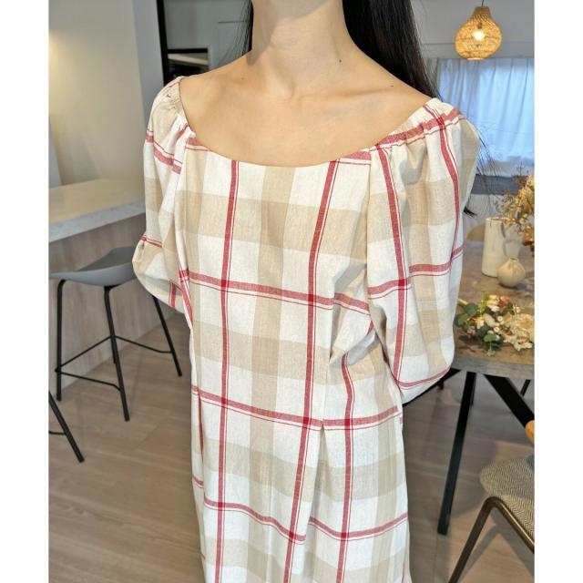 ☆大柄チェックのロングワンピース☆ボディラインが綺麗に見えるフィット&フレアのロングワンピース。シンプルな大きめチェック柄がナチュラルな印象を与えてくれます♪半袖より長めな6分丈のボリュームスリーブで二の腕周りを優しくカバー!衿ぐりは広めに設定しており、デコルテ周りは綺麗見え。ショルダー部分にはゴムが通っているのでオフショルダーにしても着られる2way仕様です*後ろウエストはゴムシャーリングで縮めてあるので、締め付け感なくウエストラインをきゅっと絞ってくれます。