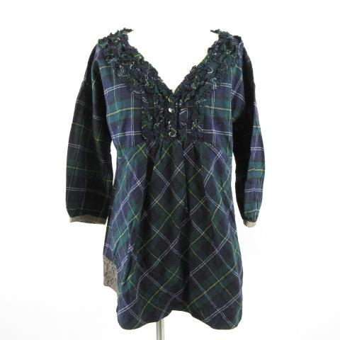 【中古】スーパーハッカ SUPER HAKKA カットソー チェック 七分袖 レース 緑 紺 *A731 レディース
