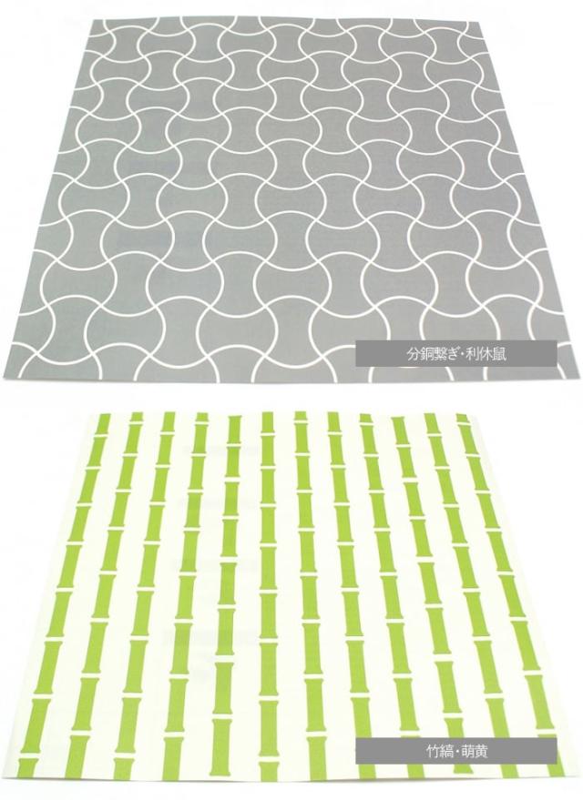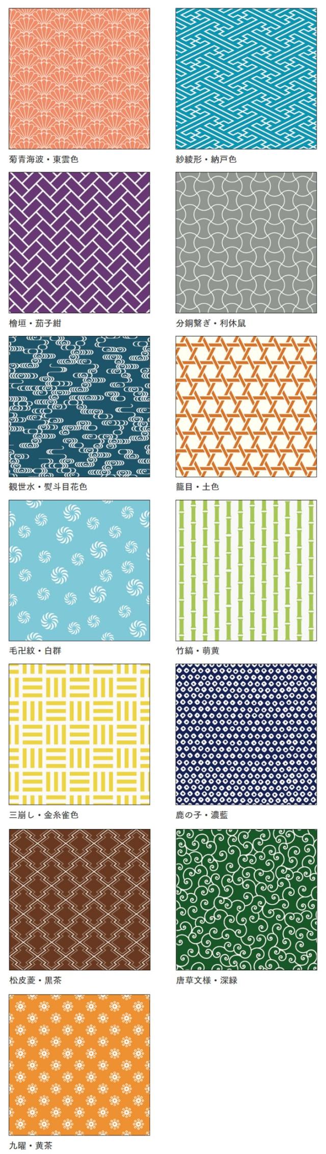 ■カラー:菊青海波・東雲色、紗綾形・納戸色、檜垣・茄子紺、分銅繋ぎ・利休鼠、観世水・熨斗目花色、籠目・土色、毛卍紋・白群、竹縞・萌黄、三崩し・金糸雀色、鹿の子・濃藍、松皮菱・黒茶、唐草文様・深緑、九曜・黄茶