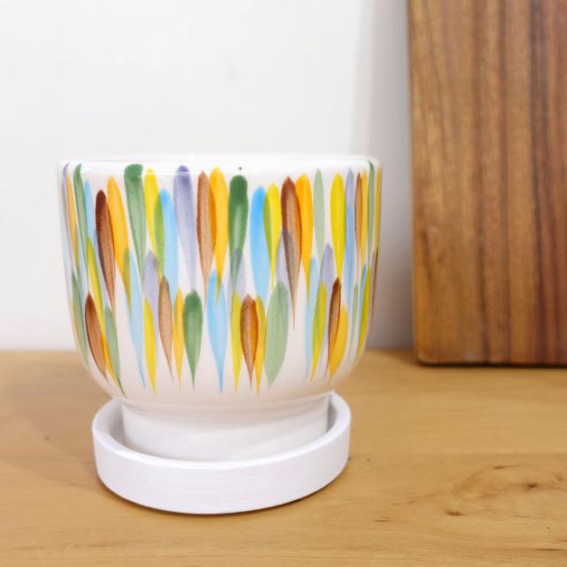 ナチュラルなホワイトベースのポットにカラフルなブラシペイントが映えるポットです。