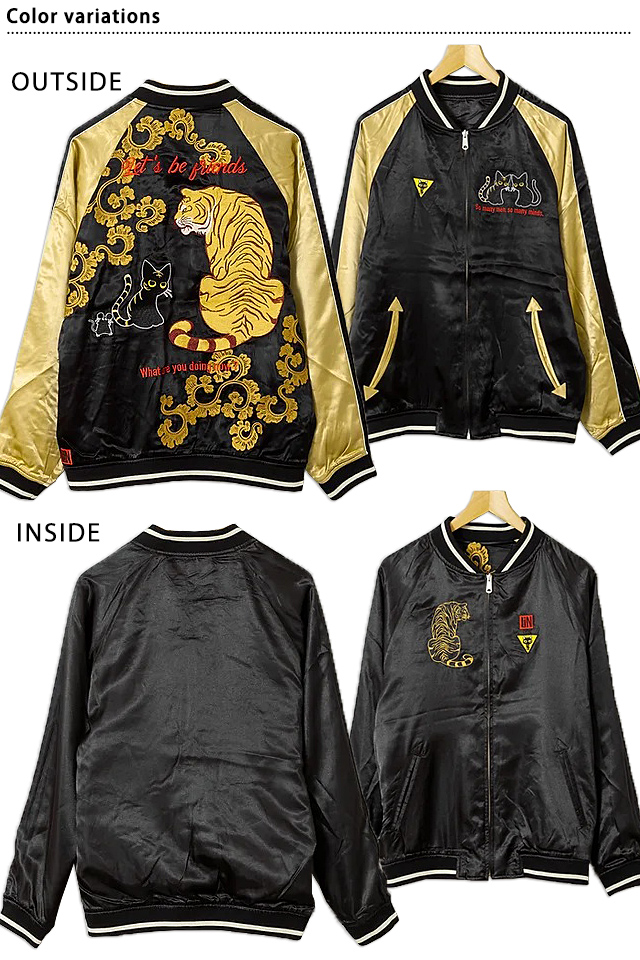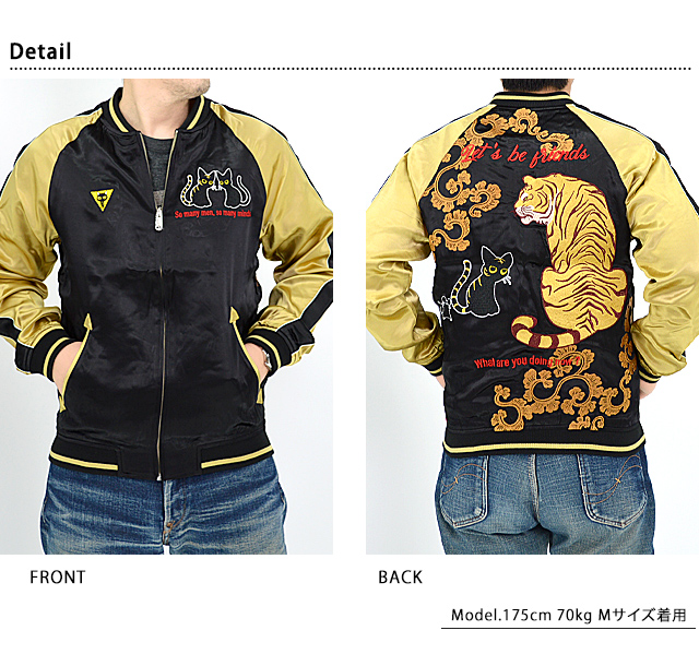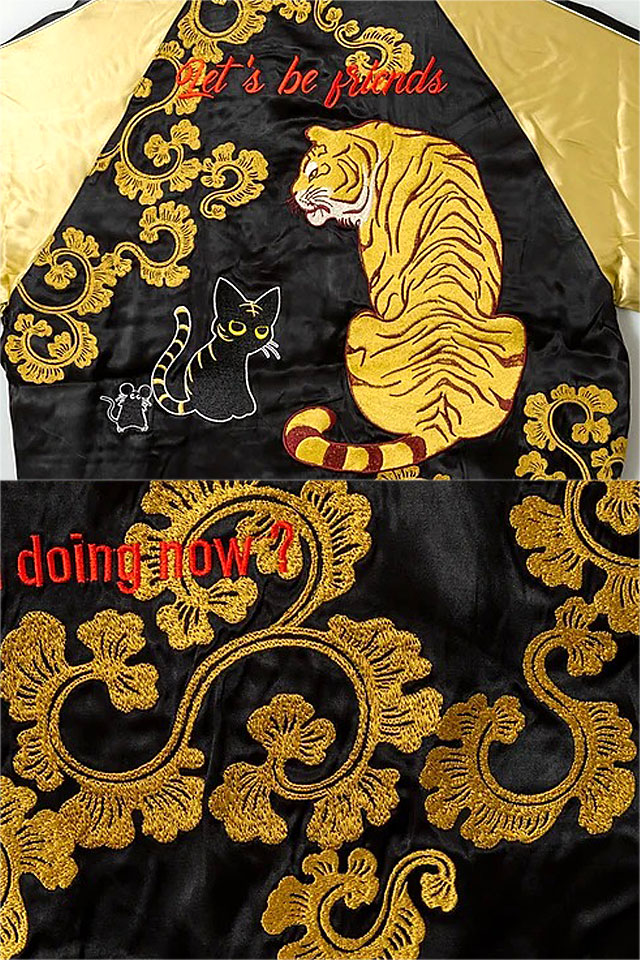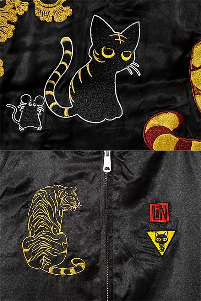 何でもあり、何でもやる新ブランド「LIN」から「ラミ&アール お友達スカジャン(AL-75606)」のご紹介です。 黒猫のLamy(ラミ)とネズミのEarl(アール)。 仲良しの猫二匹をモチーフの主役に採用しました。 表面とは対象的に、裏面はシンプルに仕上げ、メリハリを付けました。 ボディーにはレーヨンサテンを使用し、ドレープや陰影がくっきりと現れています。 | ||||||||||||||||||||