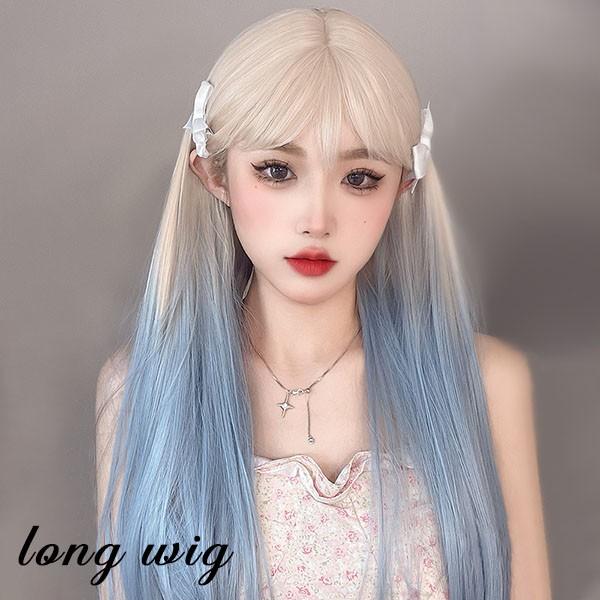 ロングウィッグ グラデーションウィッグ レディース 小顔 かつら フルウィッグ ブルー ウィッグ ロング ストレート ぱっつん前髪 ロリータ 前髪あり ハロウィン 原宿風 韓国風 コスプレ 可愛い コスチューム 仮装 大人用 普段使い 文化祭